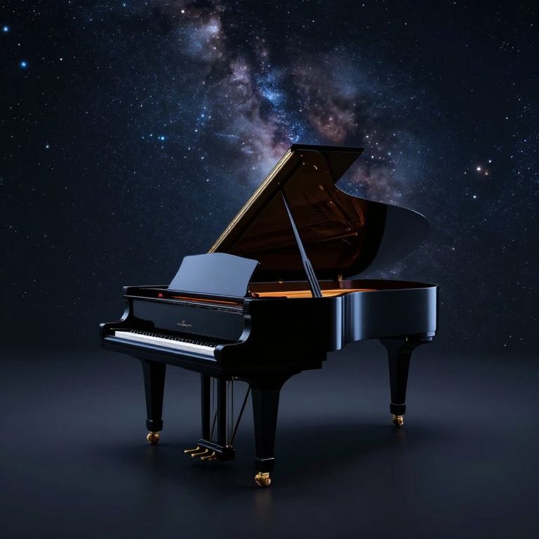 Suspended in the void, a grand piano stands as a solitary beacon of harmony, its polished surface reflecting the infinite cosmos while whispers of celestial music resonate through the silence, evoking a profound sense of solitude and the timeless longing for connection.