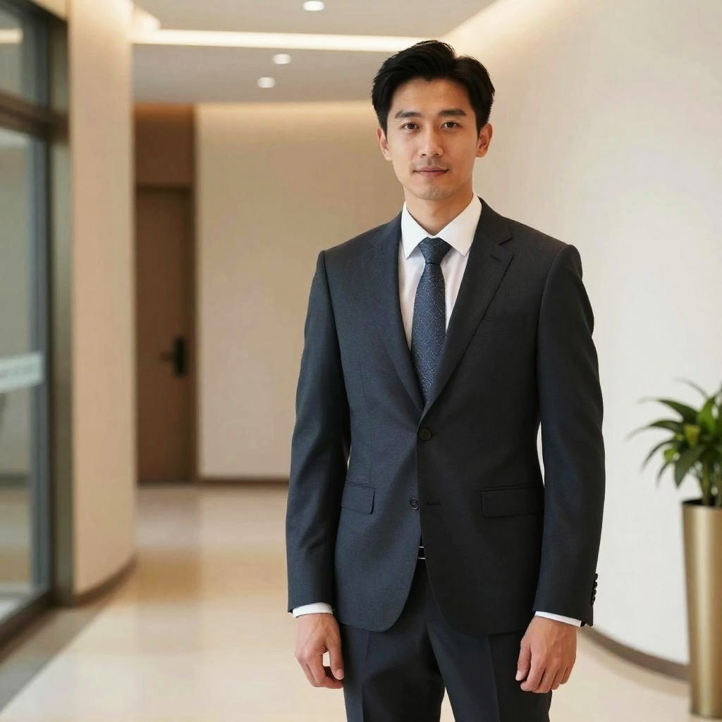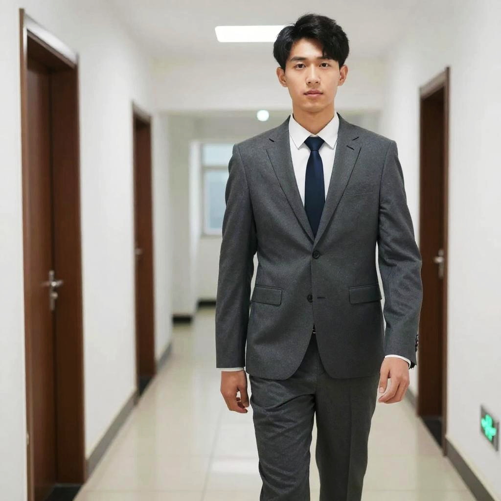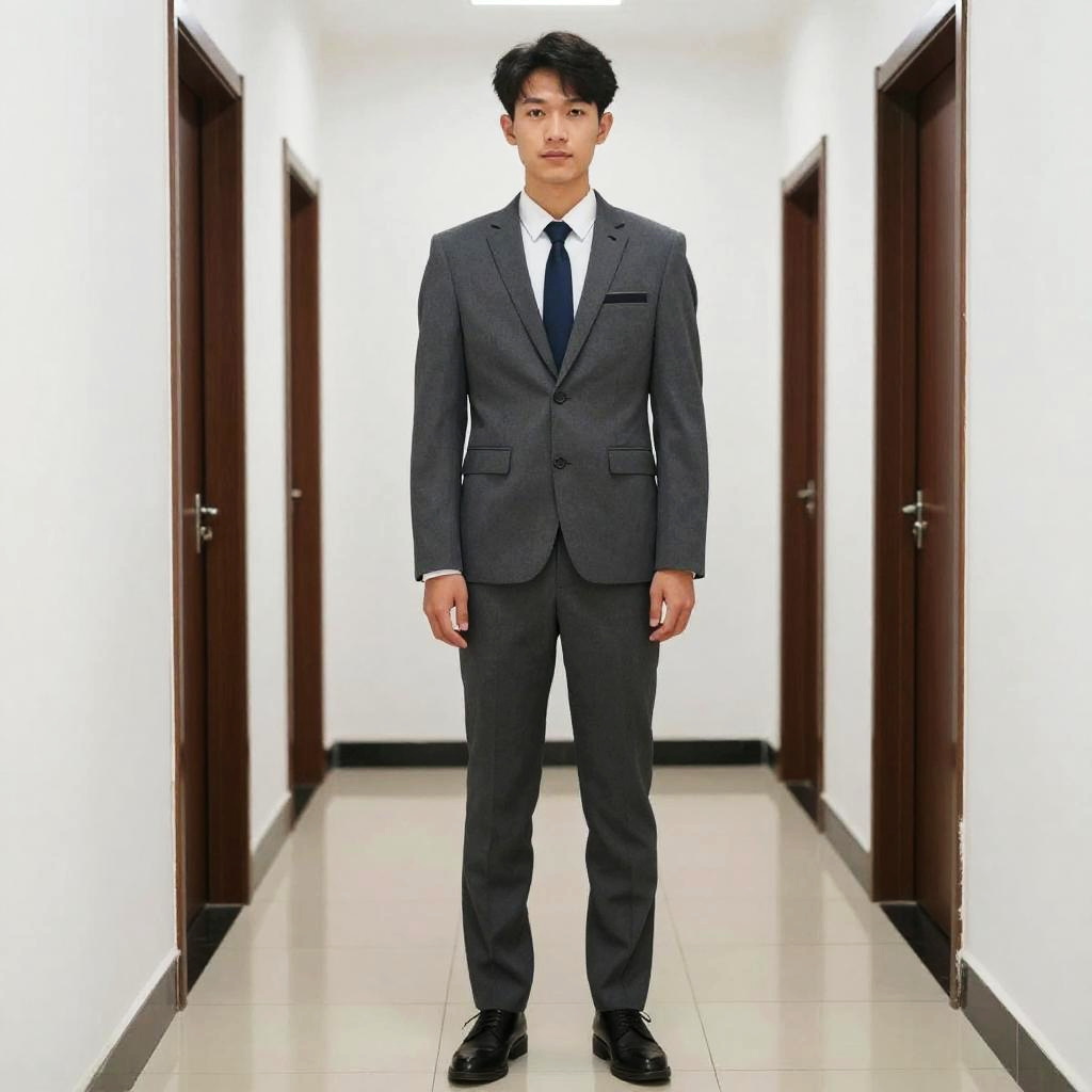 Young Asian man wearing a gray suit with a white shirt and dark tie standing in a white hallway with wooden door frames. He is dressed formally with black dress shoes, looking directly at the camera in a professional setting.