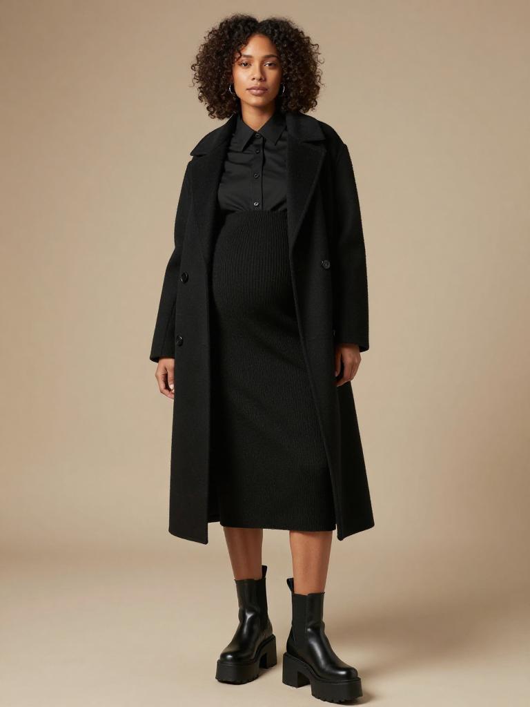 Fashionable pregnant woman with natural curly afro hair wearing a sleek monochrome all-black outfit. She is dressed in a structured black button-up shirt with a crisp collar, paired with a longline black wool coat featuring clean lapels. Her black ribbed knit midi skirt hugs her baby bump, complemented by chunky black platform boots for an edgy and elegant evening-ready look. The photo is taken in a warm beige studio with soft, flattering lighting and a gentle falloff background, highlighting high-end maternity fashion.