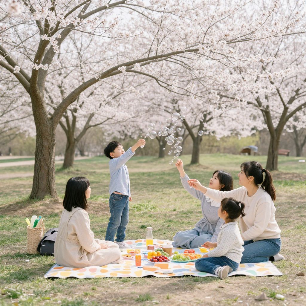 Photograph of a Japanese family enjoying a picnic under blooming cherry blossom trees, with children tossing petals into the air.