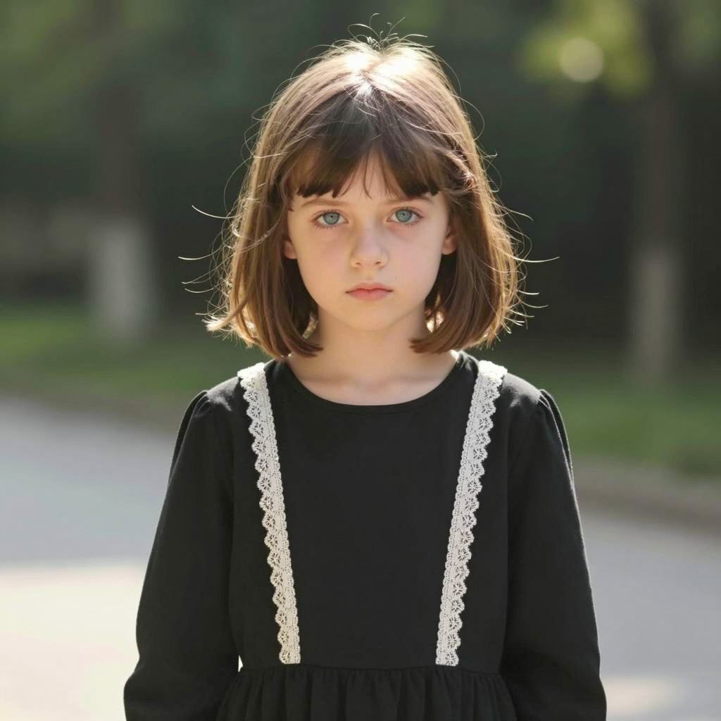 Unusual fancy dress, photograph of young boy, brown hair, serious expression, wearing beige dress with brown suspenders, white lace puffy sleeves, black buttons, standing outdoors, daytime, blurred background, natural light, casual setting, realistic style, portrait view, front-facing, child fashion, subtle colors, soft ure