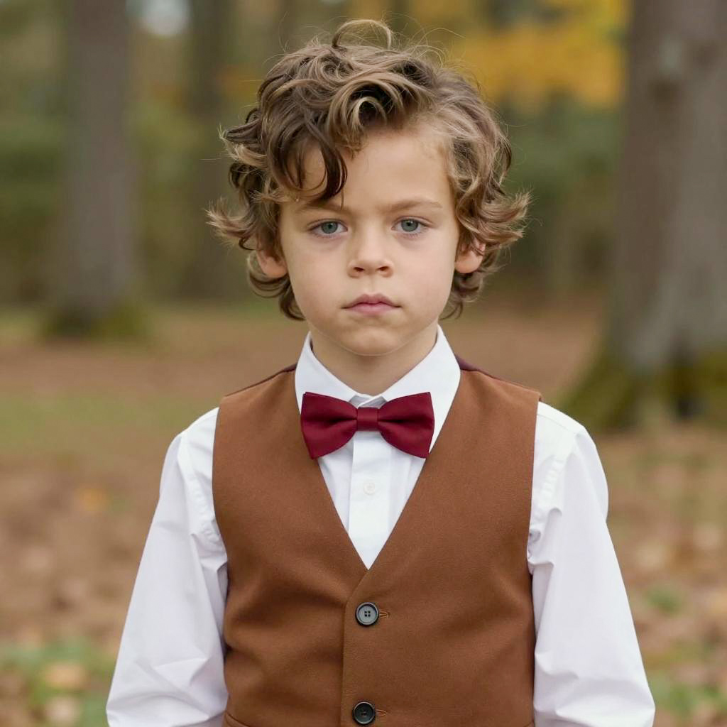 Portrait of a young boy with brown hair and a serious expression wearing a beige dress with brown suspenders, white lace puffy sleeves, and black buttons. The photo is taken outdoors in natural daytime light with a blurred background.