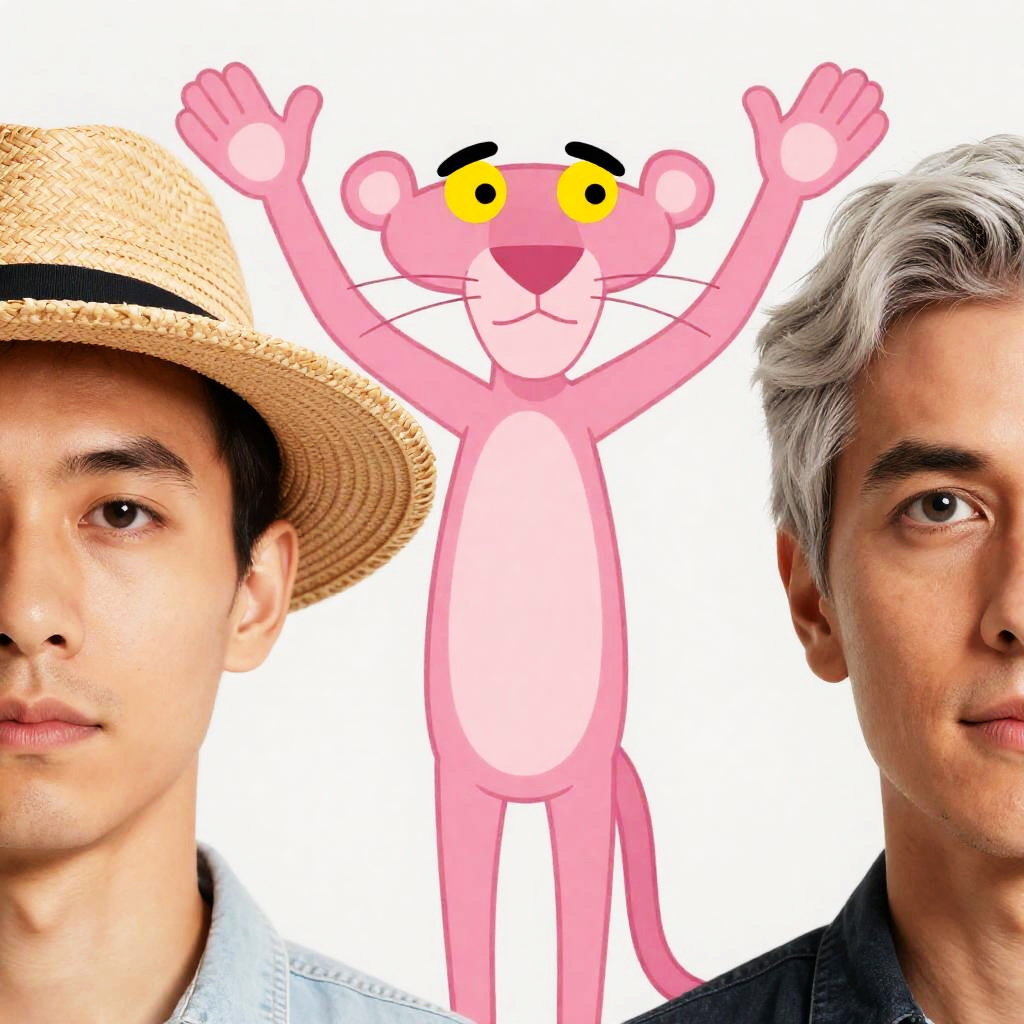 Photograph of two men's faces on either side with a pink cartoon panther between them, arms raised. Left man wears straw hat, right man with gray hair. Panter has yellow eyes, pink nose, and small ears. Both men's eyes wide.