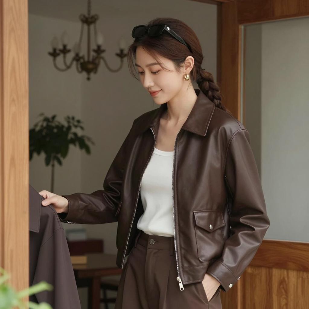 Woman work clothes boutique, photograph of a young woman standing on a city sidewalk, wearing a beige cap, brown apron over a brown shirt, light blue skinny jeans, and brown boots, carrying a black backpack, standing in front of a store with a glass door and hanging clothes, daytime, urban setting, casual style, natural light, street fashion, realistic photography style, medium shot, relaxed pose