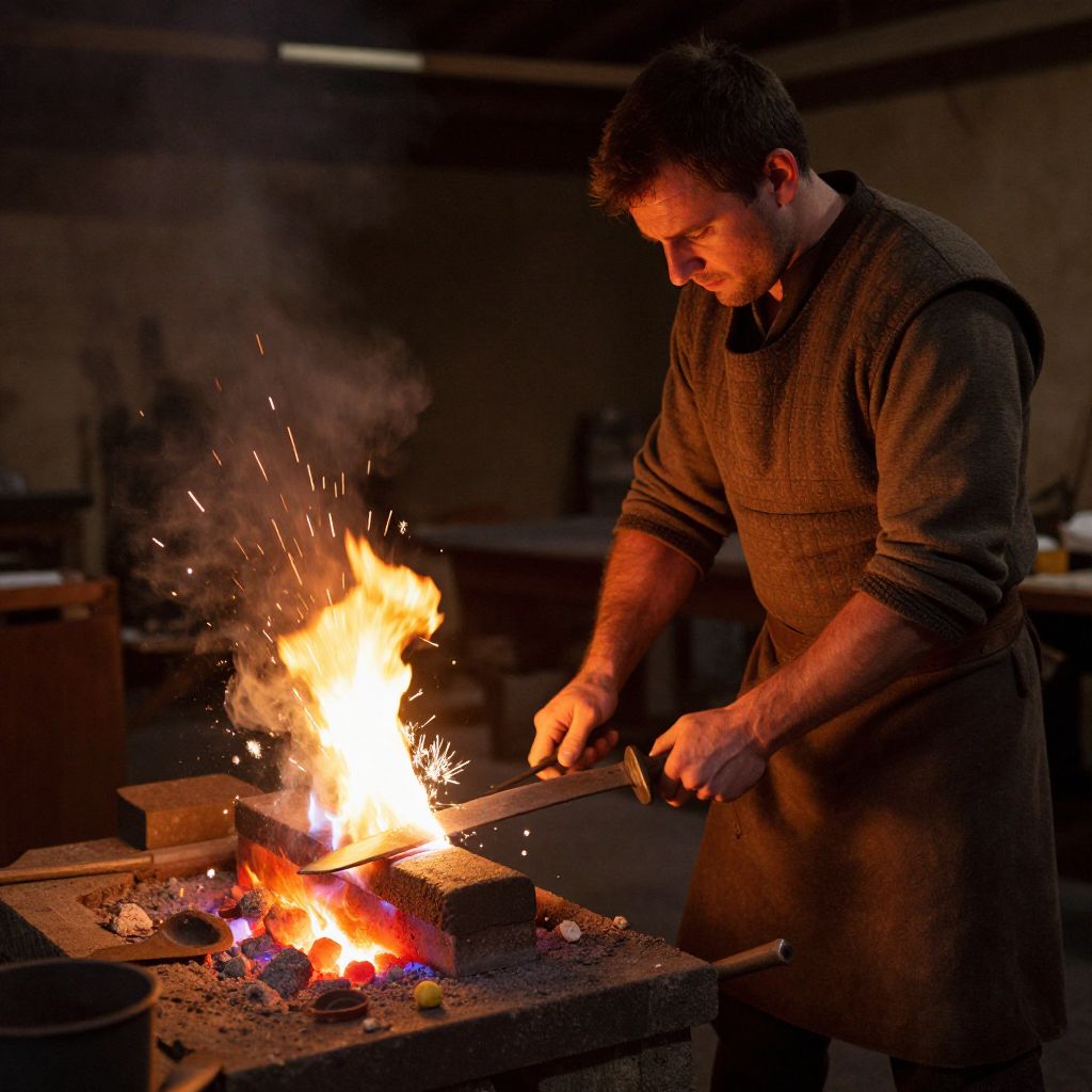 Photograph of a bearded man in a brown apron, hammering metal over a fiery forge, surrounded by sparks and dimly lit workshop.