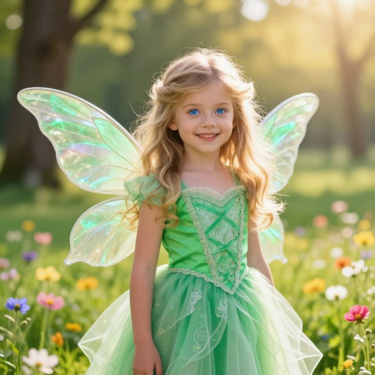 A beautiful young girl with long, flowing blonde hair and soft blue eyes stands in a magical forest setting, wearing an elegant orange and white costume with intricate floral patterns. She has large, delicate wings made of shimmering, translucent fabric that gently flutter in the breeze, and a soft white hood with orange trim covers her face, revealing only her expressive eyes. The scene is bathed in golden sunlight filtering through the trees, with glowing leaves and a peaceful, enchanted atmosphere surrounding her.