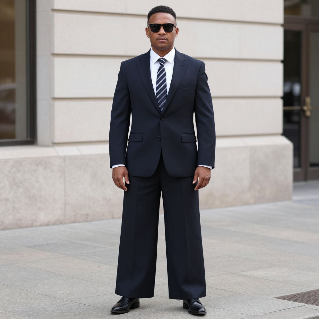 Photograph of a Black man standing confidently in an urban setting. He wears a dark navy, tailored, double-breasted suit with wide, cuffed trousers, a white dress shirt, and a black-and-white striped tie. He has short, neatly groomed hair and is wearing dark sunglasses. His black dress shoes are polished and shiny. The background features a white, stone building with large windows and a glass door. The sidewalk is light gray and clean. The man's posture is straight, and he gazes directly at the camera. The overall style is formal and sophisticated.