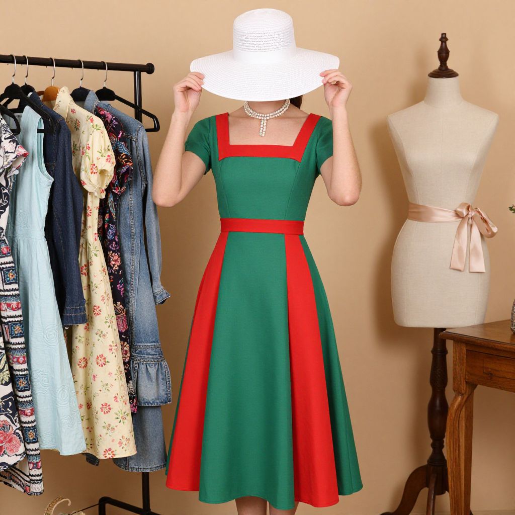 Photograph of a woman wearing a green and red dress with a red square neckline and red waistband, paired with a wide-brimmed white hat and pearl necklace. She stands in a room with a beige wall, next to a clothing rack displaying various patterned dresses and a dress form in a cream-colored bodice with a beige sash. The dress has a vintage, 1950s-style silhouette. The room has a wooden table on the right. The woman's face is obscured by the hat, making her identity unknown.