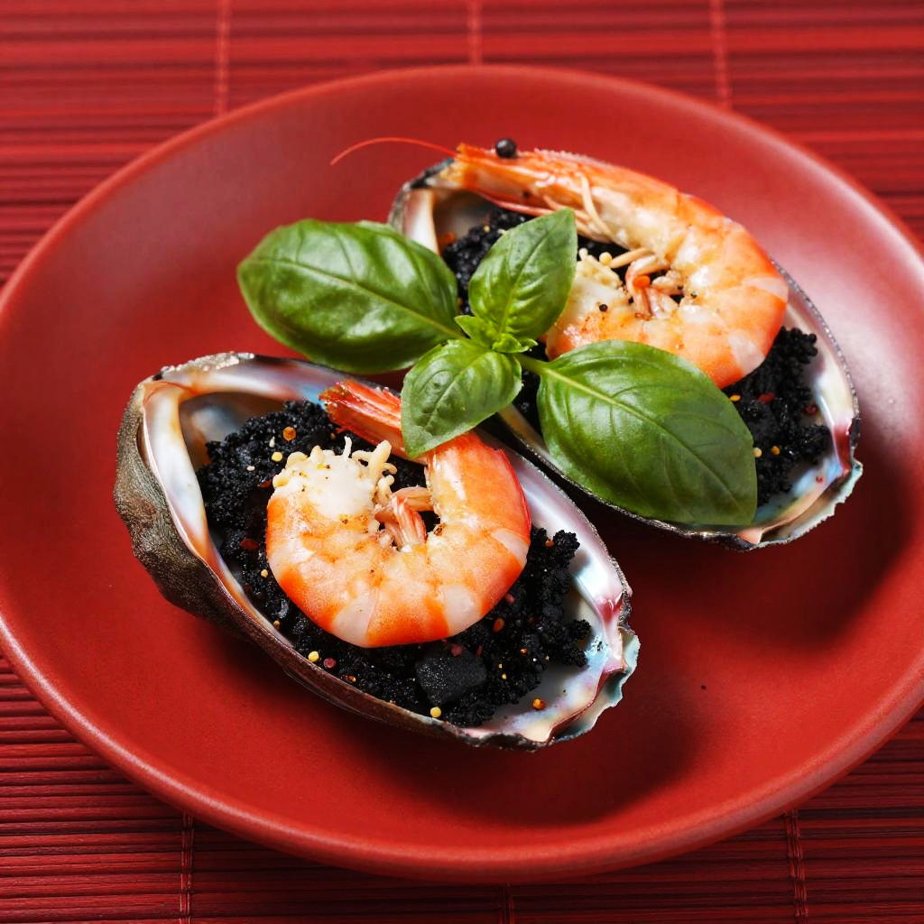 A vibrant photograph of two black squid ink stuffed shells topped with bright orange shrimp, fresh green basil leaves, and a sprinkle of red pepper flakes. The shells are arranged on a shiny, red ceramic plate, set against a red and striped background. The image is colorful and appetizing, emphasizing the contrast between the dark shells and the bright shrimp and basil.