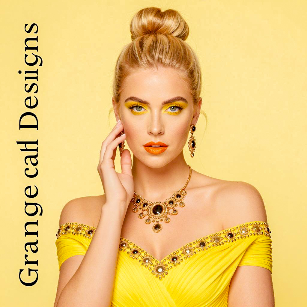 Photograph of a blonde woman with a high bun, yellow eyeshadow, and orange lipstick. She wears a yellow off-shoulder dress with gold embellishments and a matching ornate necklace and earrings. Her right hand touches her cheek. Bright yellow background. Her expression is neutral. "Grange Peach Designs" on the left.