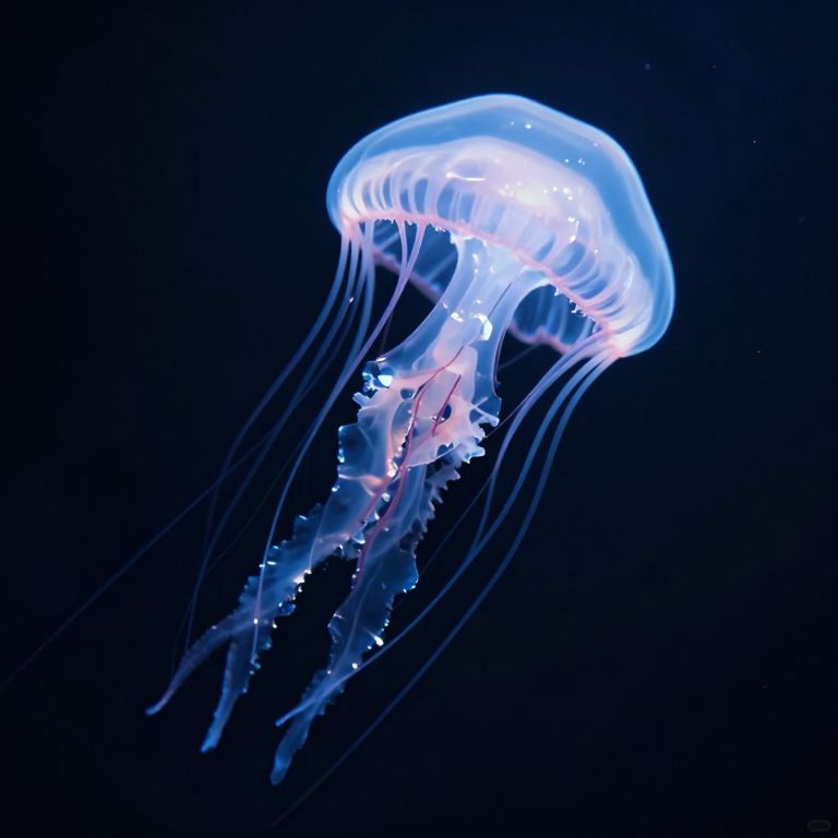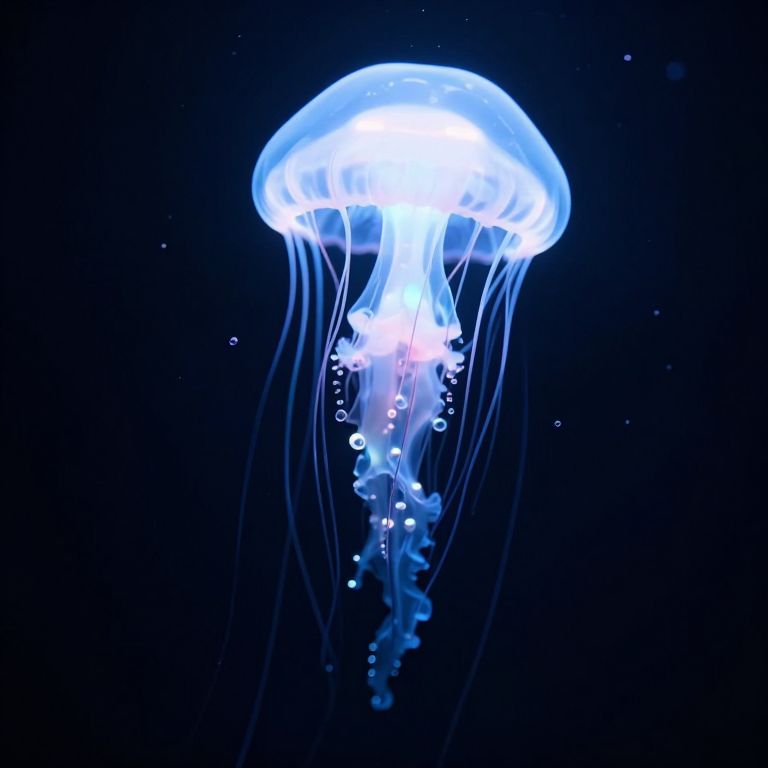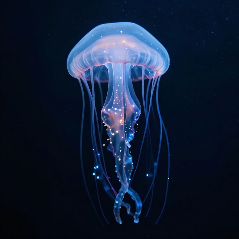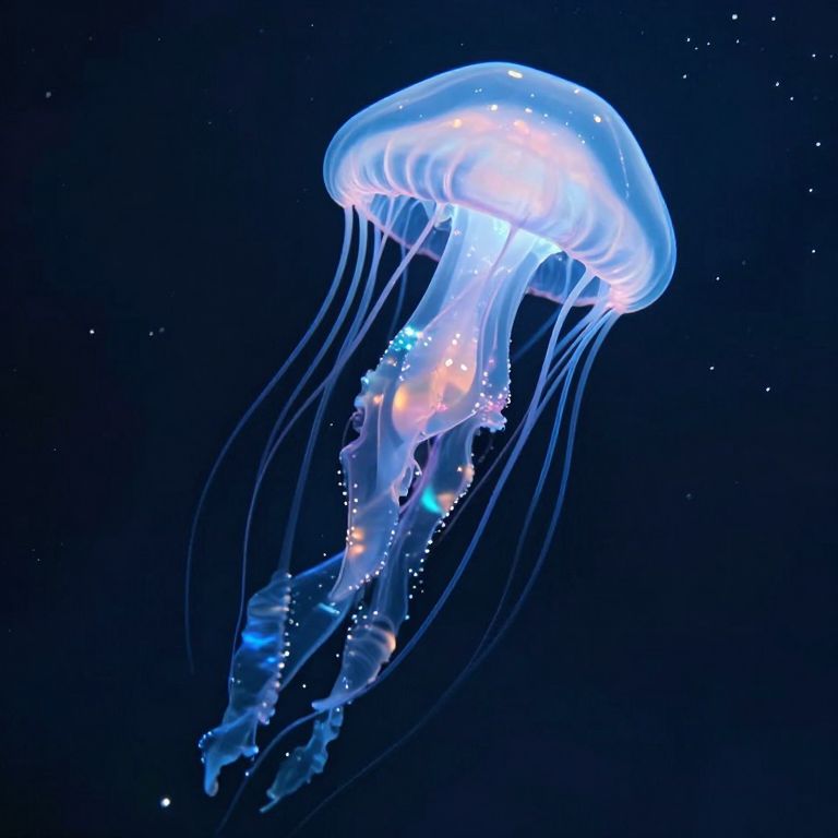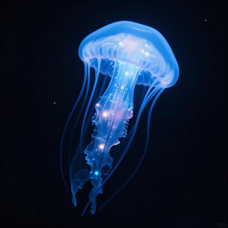 A colossal jellyfish bathed in ethereal blue light cradles a luminous cityscape within its translucent bell, defying gravity as it floats serenely against a dark, infinite backdrop.
