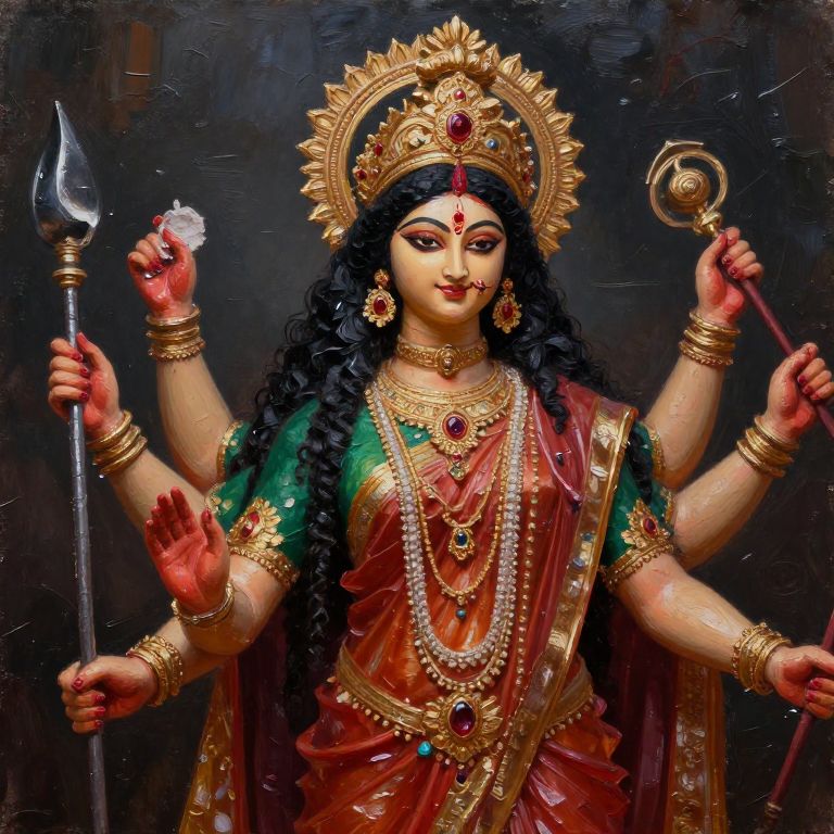Detailed close-up of a statue of Hindu goddess Durga Maa adorned in a traditional purple and teal saree with gold embroidery and intricate jewelry. The statue features multiple arms, symbolizing divine power and protection, captured with vivid lighting and color grading effects.