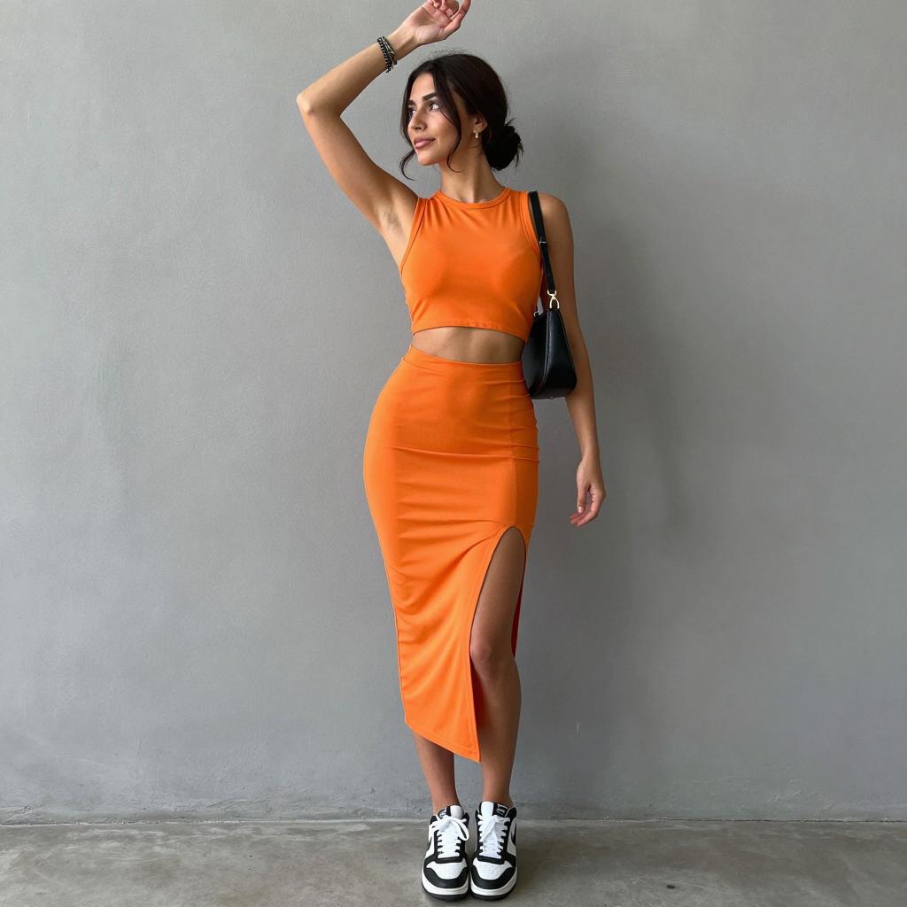 Woman in orange, sleeveless, form-fitting dress with cutout and high slit, black shoulder bag, black and white sneakers, gray floor, gray wall, standing, left arm raised, bracelets on wrist, dark hair in a loose bun.