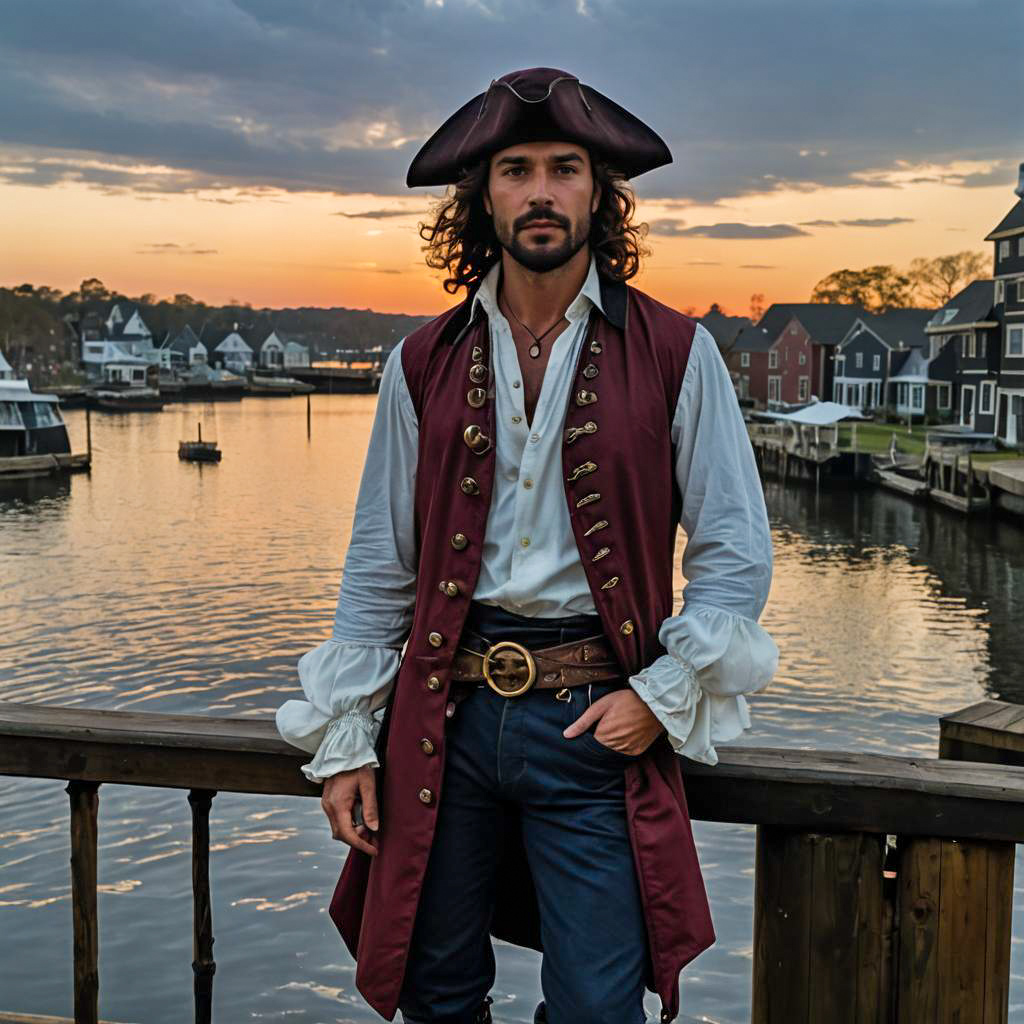 Pirate Man Standing on Moonlit Dock at Sunset