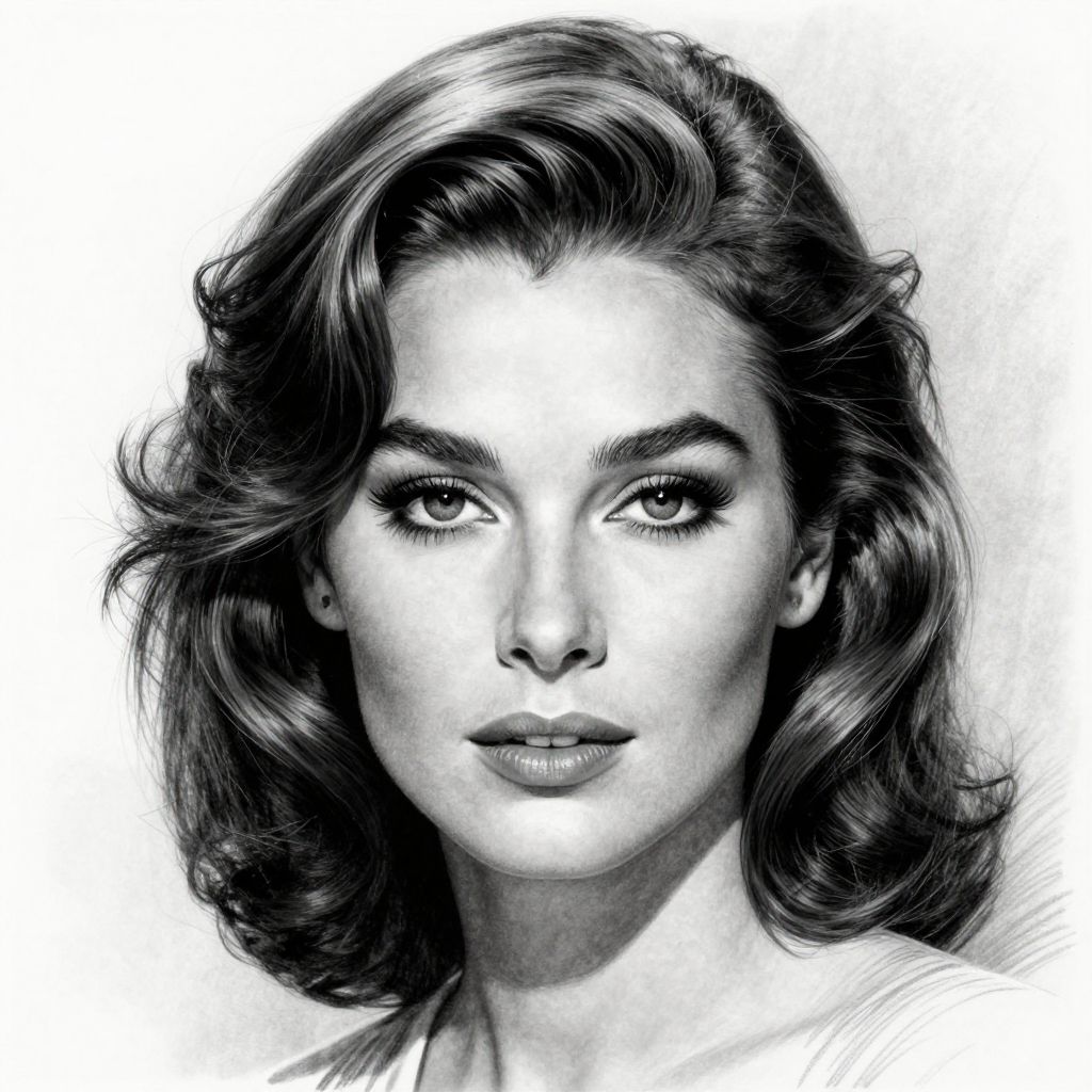 Black-and-white digital portrait of a woman with wavy hair, intense gaze, and detailed shading, capturing a classic, timeless look.