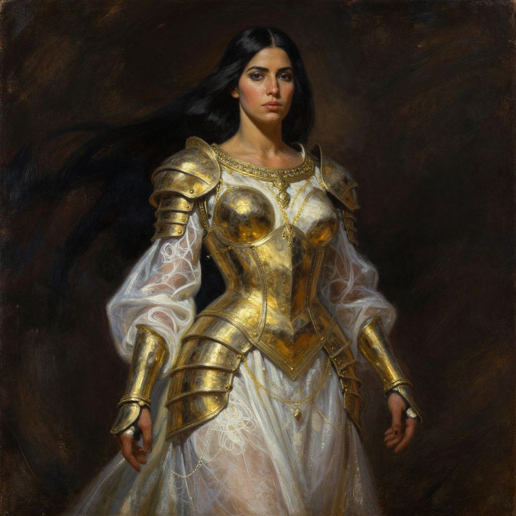 Digital painting of a strong, dark-haired woman in golden armor with intricate designs and a white, translucent, flowing dress. Her armor covers her chest and shoulders, with detailed shoulder plates and gauntlets. The dress has puffed sleeves and a delicate pattern. She has a serious, determined expression and stands against a dark, almost black background, highlighting her figure. The lighting emphasizes the gold of her armor, creating a contrast with the white dress. Her skin tone is light, and her features are sharp and elegant. The style is reminiscent of classical portraiture with a modern digital twist.