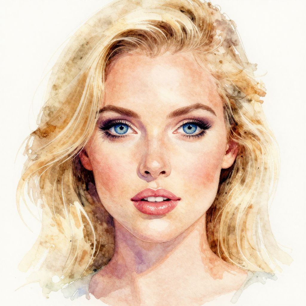 Watercolor portrait of a blonde woman with blue eyes, fair skin, and pink lips, featuring soft, wavy hair and a neutral expression.