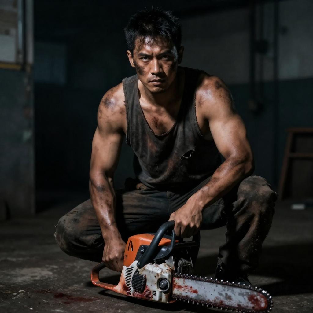 Photograph of a muscular, dark-haired man with a rugged, dirty appearance, crouching in a dimly lit, industrial setting. He wears a torn, sleeveless shirt, exposing his muscular arms, and holds a blood-stained chainsaw in his right hand. His intense expression and shadowed face convey determination. The background includes metal structures and dim lighting, enhancing the gritty atmosphere.