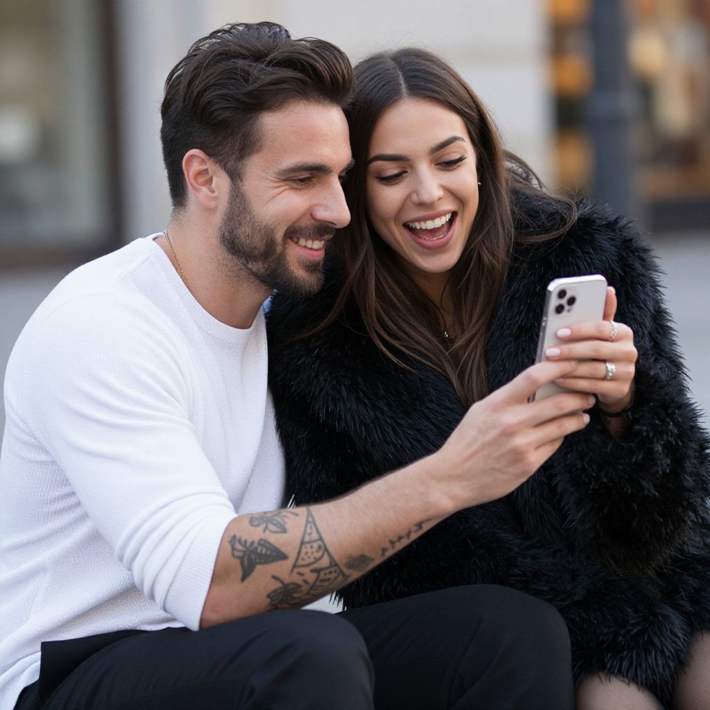 Photograph of a happy couple sitting closely together, both smiling at a smartphone held by the man. The man, with dark hair, a beard, and tattoos on his right forearm, wears a white long-sleeve shirt and black pants. The woman, with long dark hair, wears a black fur coat and black pants. She leans into the man, her arm around his shoulder. The background is blurred, featuring urban elements. The man's left hand rests on the woman's coat, and she wears a ring on her right hand. The image has a natural, candid feel.