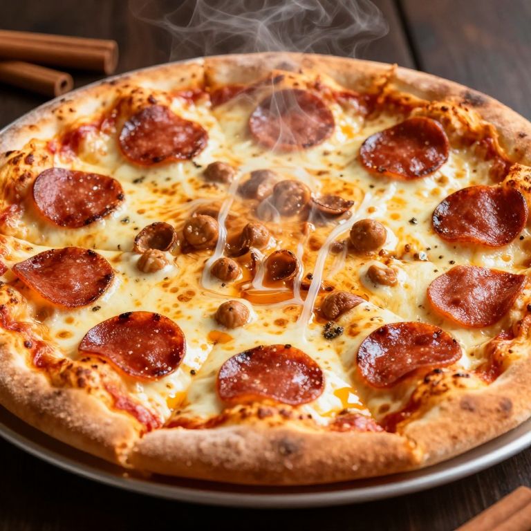Cinnamon food photography of a pepperoni and eyeball pizza, volumetric lighting, steaming, gooey cheese,