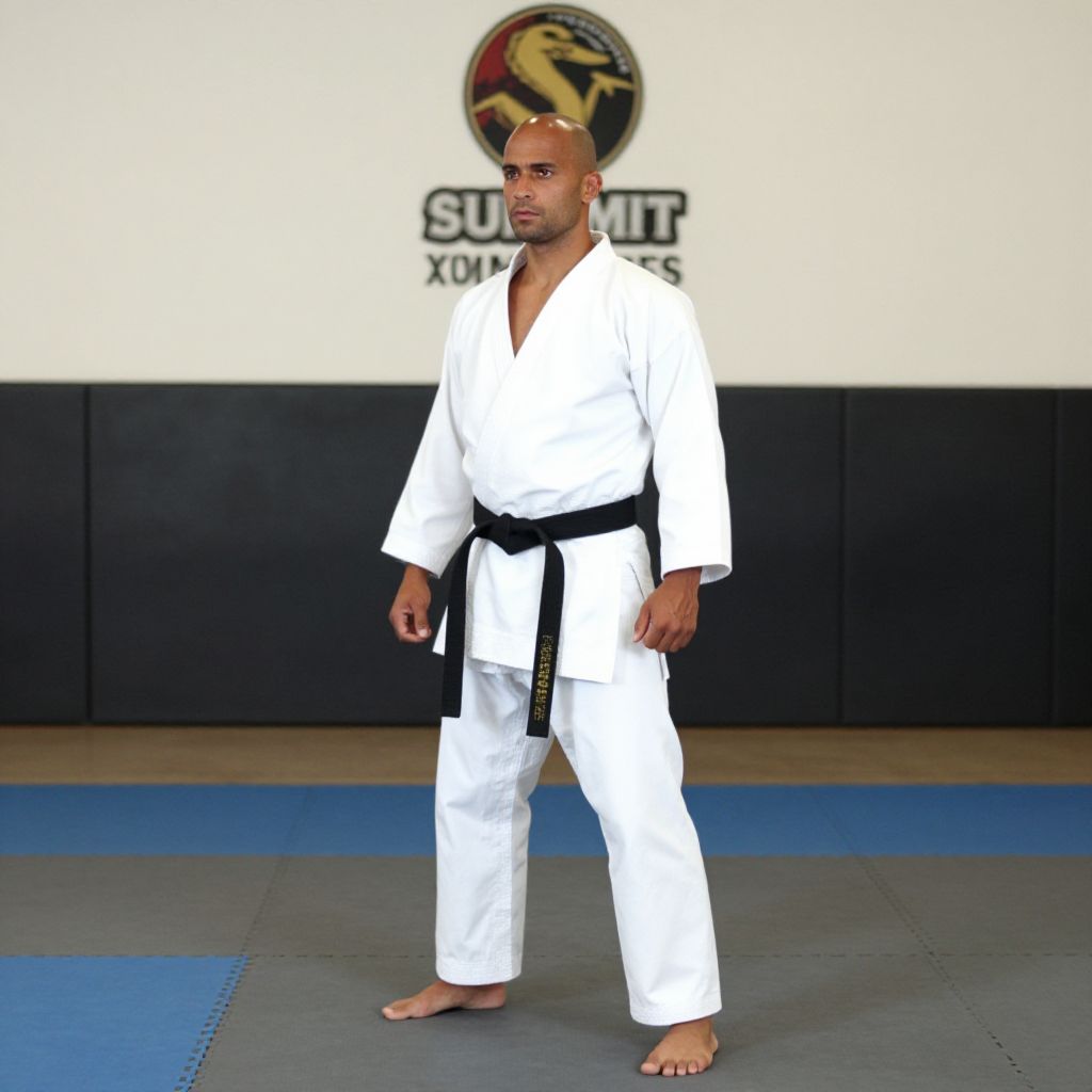 "Summit Martial Arts, man in a white karate uniform posing for a picture"