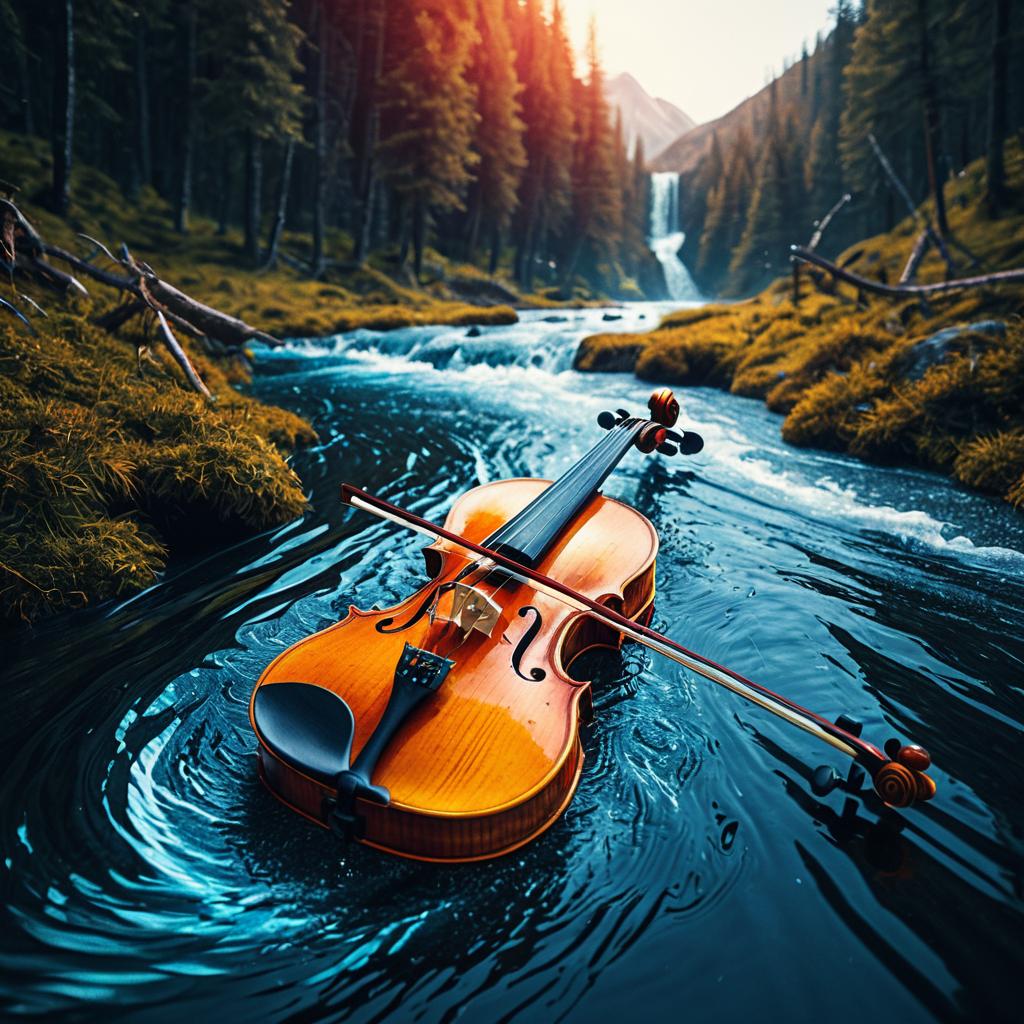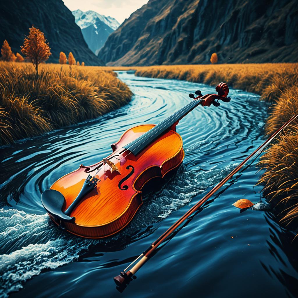 Surrealistic 8K illustration featuring a violin morphing into a river, rendered with vibrant and intense colors. The scene includes flowing wood grain textures and a dreamlike atmosphere with surreal, high-quality ultra-detailed lighting.