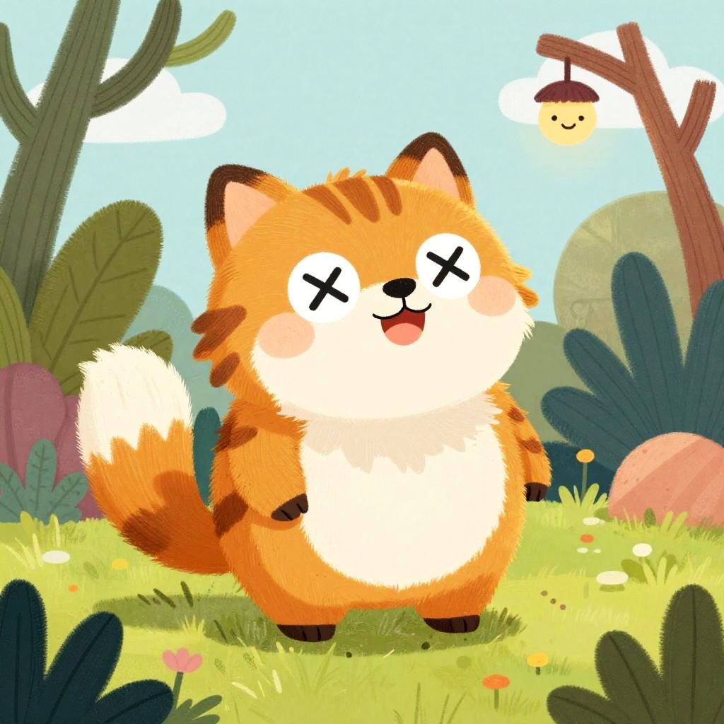 Cute digital illustration of a chubby, orange and white cartoon fox with X eyes, standing in a sunny, colorful forest with cacti, flowers