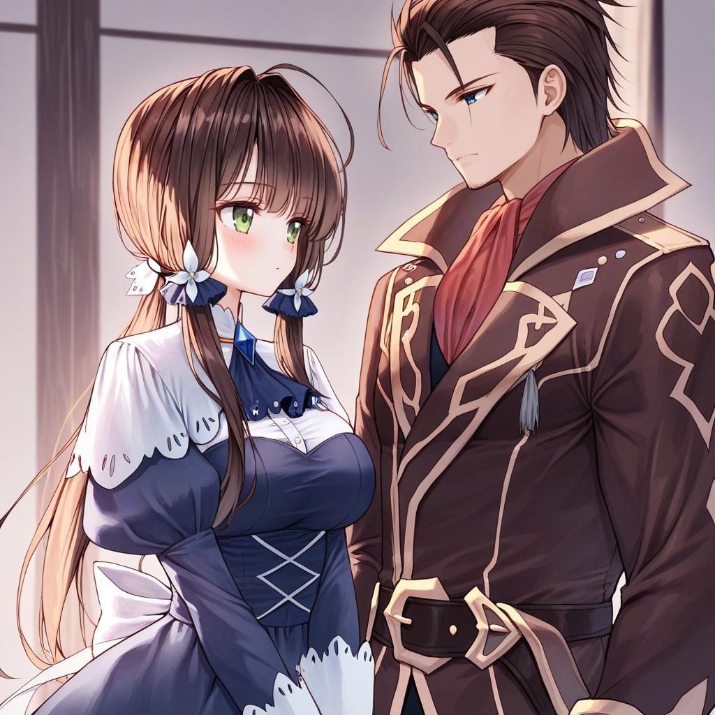 Digital anime-style artwork featuring a young man with brown hair and brown eyes wearing a brown coat and white ascot, standing close to a young woman with long silver hair and golden eyes, dressed in a black and white outfit adorned with a blue gem and floral hair accessories. The scene conveys a calm and introspective mood.