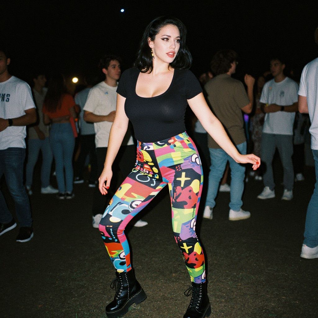 Athletic woman, eastman film stock, wearing a black scoop neck t-shirt, colorful pop art print leggings, and black chunky lace-up boots, dancing at a silent disco under the stars. Sexy. Pretty face and beаutiful eyes. Big breasts