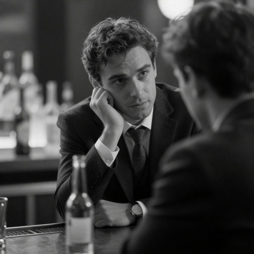 Black-and-white photograph of two men in a vintage café. Man on right, in suit with tie, looks down, smoking. Man on left, in suit, faces him. Ornate metal railing in background. Table with cups and teapot between them. Flower on railing. Both men have short, dark hair. Intense, focused expressions.