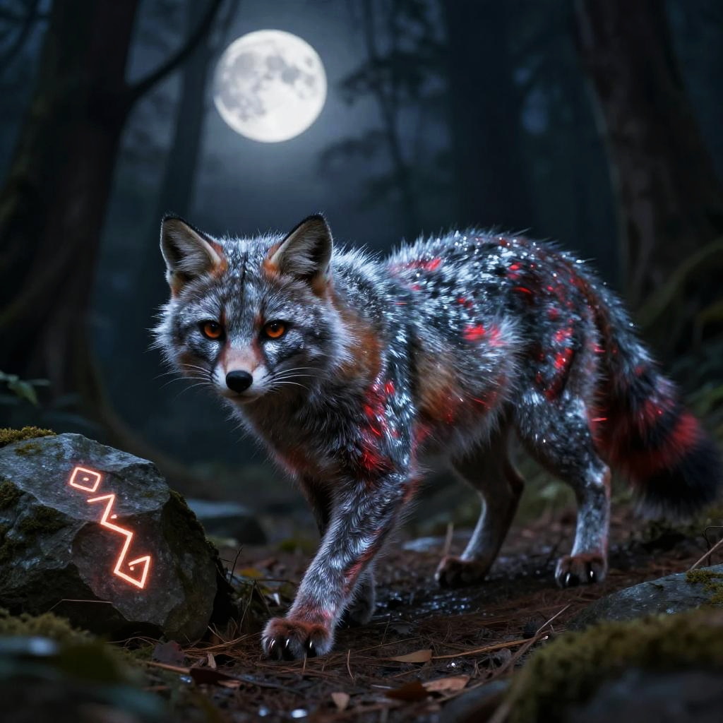 Mystical gato zorro prowling a moonlit mystical forest, fur shimmering with silver and red hues, glowing mystical runes engraved on nearby rocks, fantasy realism style