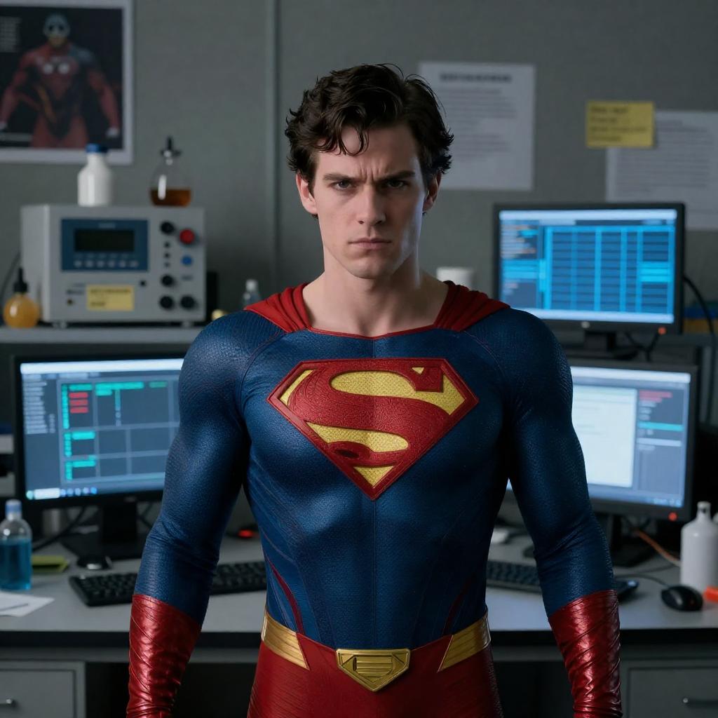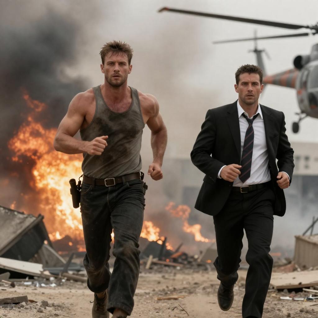 Man with medium build, brown hair, intense expression, wearing dark shirt and red jacket, running away from large orange explosion. Car wheel partially visible on left. Background filled with flames and debris. Man's right arm extended forward, left arm back.
