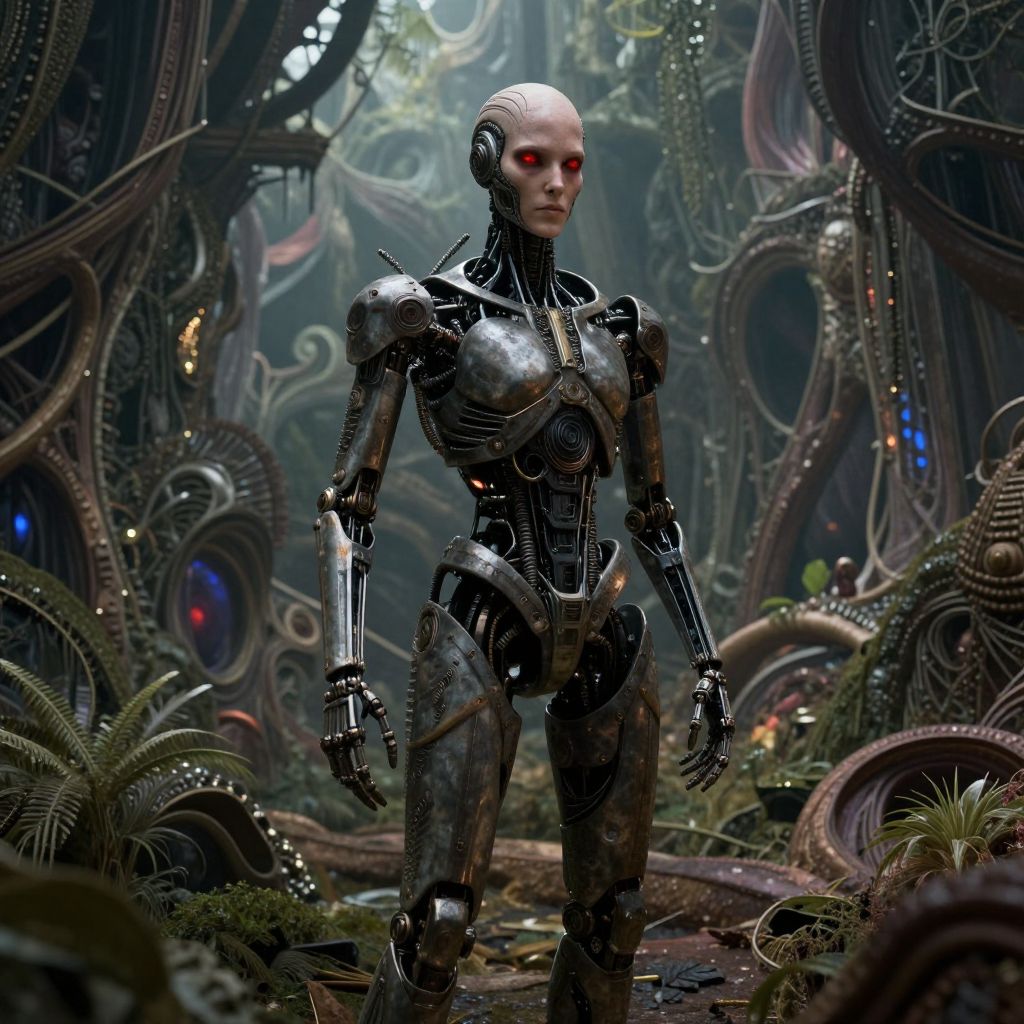 Digital sci-fi artwork: A sleek, metallic android with red eyes stands in a dark, organic, futuristic forest filled with twisted, glowing vegetation.