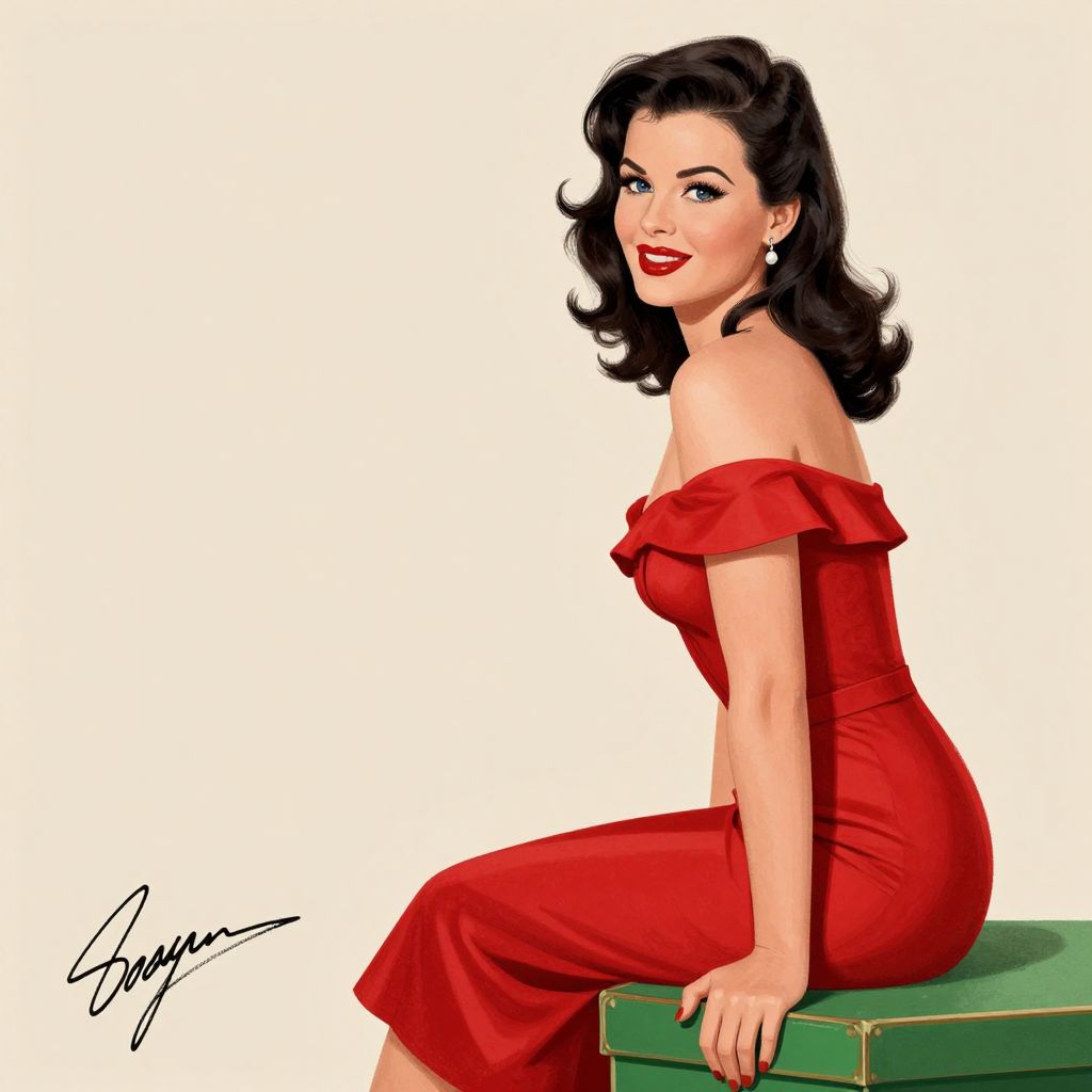 Seductive pin-up illustration featuring a woman in a vibrant red off-the-shoulder dress, gracefully seated on a green box with her hand resting on its surface, set against a soft beige background with a signature in the lower-left corner.