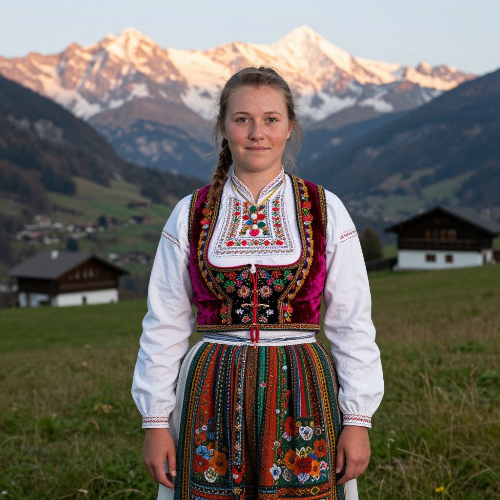 Photograph of a young Caucasian woman with light skin and brown hair in braids, standing in a grassy field. She wears a traditional Alpine outfit with a white long-sleeve blouse, red and black embroidered bodice, and colorful, intricately patterned skirt. Her expression is neutral. In the background, a mountain range with snow-capped peaks is illuminated by the setting sun, and several dark wooden chalets are scattered across the green landscape. The image has vibrant colors and sharp details, emphasizing the cultural attire and natural beauty of the Alpine setting.