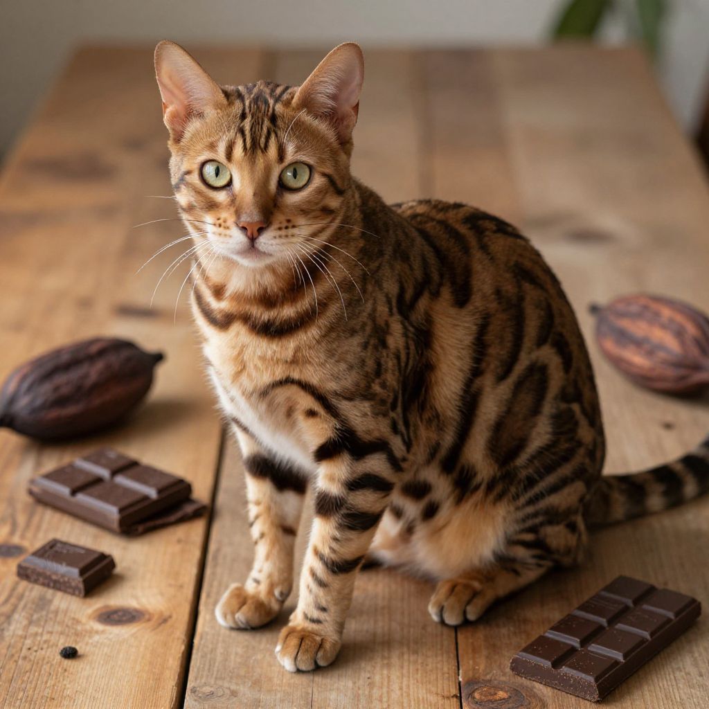 Chocolate Bengal cat sitting elegantly on a rustic wooden table surrounded by dark chocolate bars and cocoa pods, soft natural lighting highlighting the luxurious fur texture, highly detailed