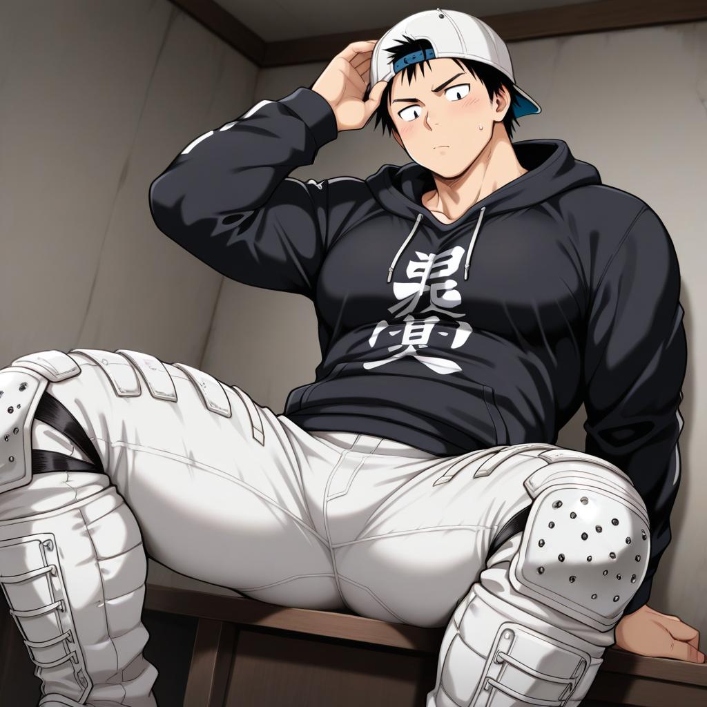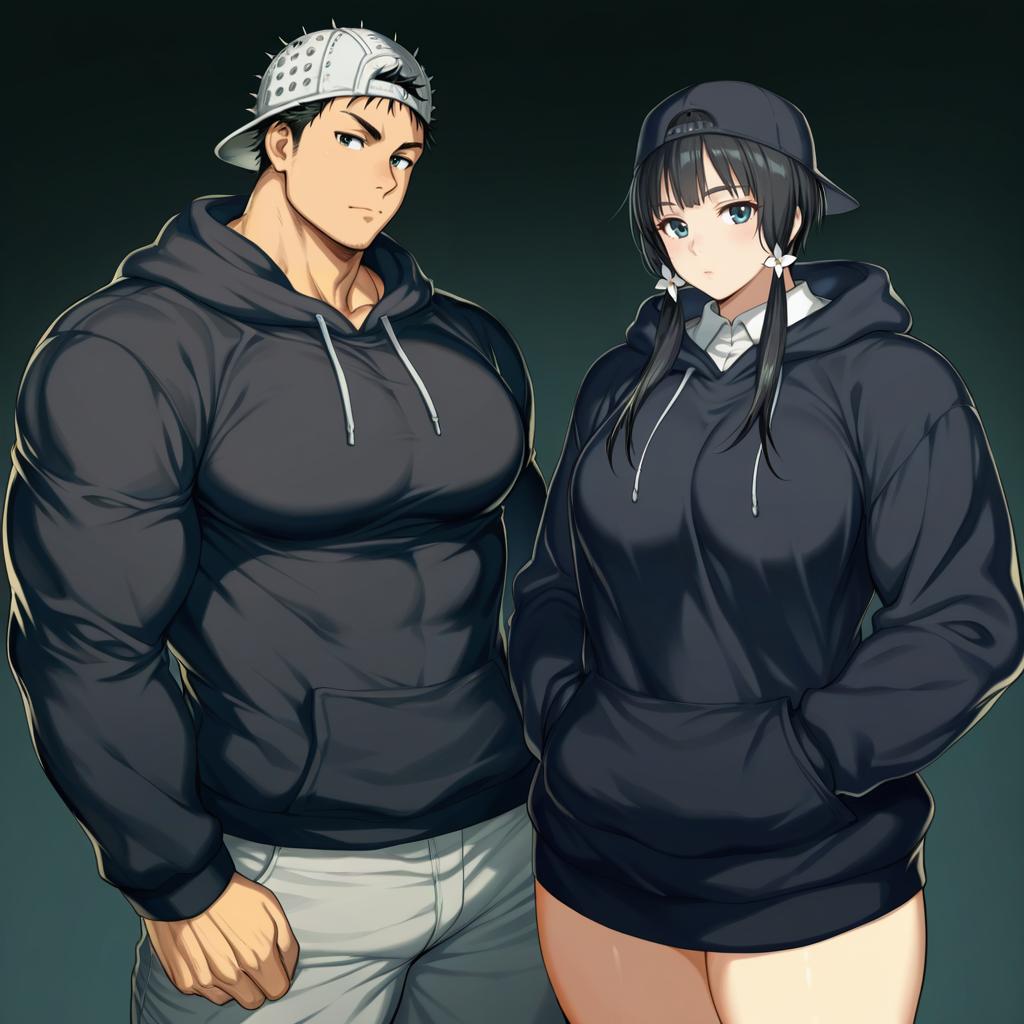 Aikawa (dorohedoro), dorohedoro, 1boy, thick eyebrows, short hair, black hair, thick thighs, black hoodie, backwards hat, bara, muscular male, sideburns, large pectorals, pectorals, by artist icomochi, illustrious