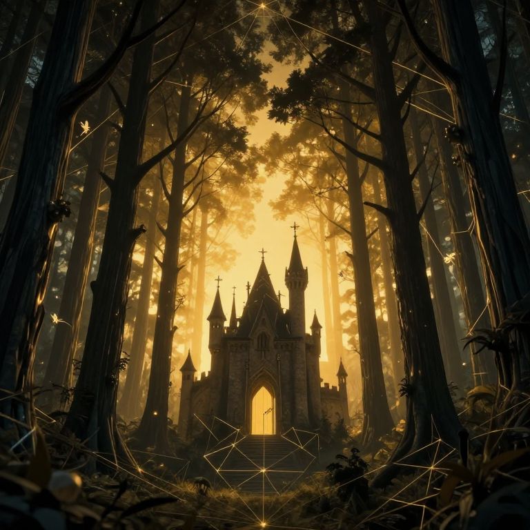 The image presents an intricately designed, inverted mystical forest scene within the confines of a castle. The forest is composed of tall, slender trees with dark, almost black trunks and branches that extend upwards, creating a dense, almost tunnel-like effect. The trees are illuminated by a warm, golden light that emanates from the center of the image, casting a glow that highlights the geometric shapes and lines that frame the scene. These lines, in a golden hue, form a complex network of triangles and other geometric figures, adding a sense of depth and structure to the image. The castle, located at the center of the forest, is a small, intricately designed structure with a pointed roof and a door that appears to be slightly ajar. The overall composition is balanced, with the forest and castle creating a harmonious interplay of natural and architectural elements. The scene is further enhanced by the presence of small, fairy-like figures that float among the trees, adding a whimsical touch to the otherwise serene and mystical atmosphere.