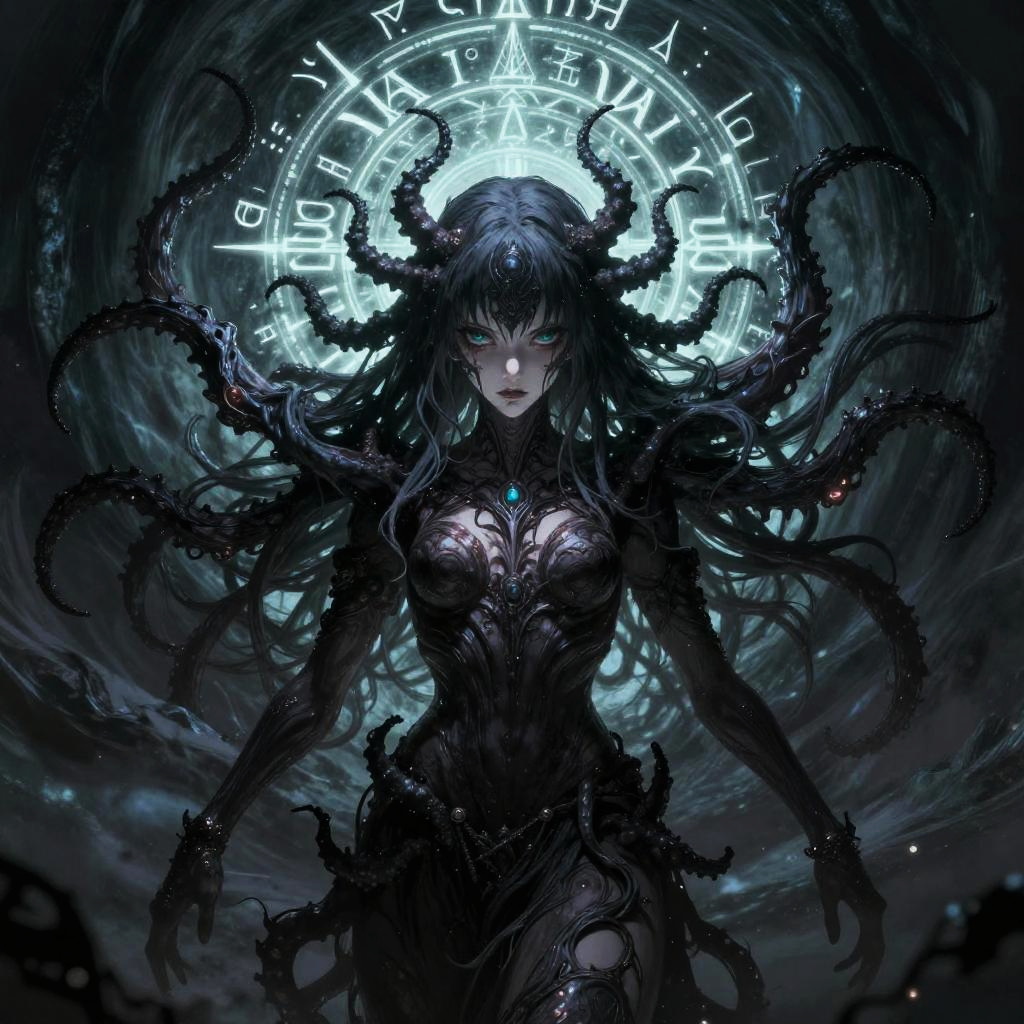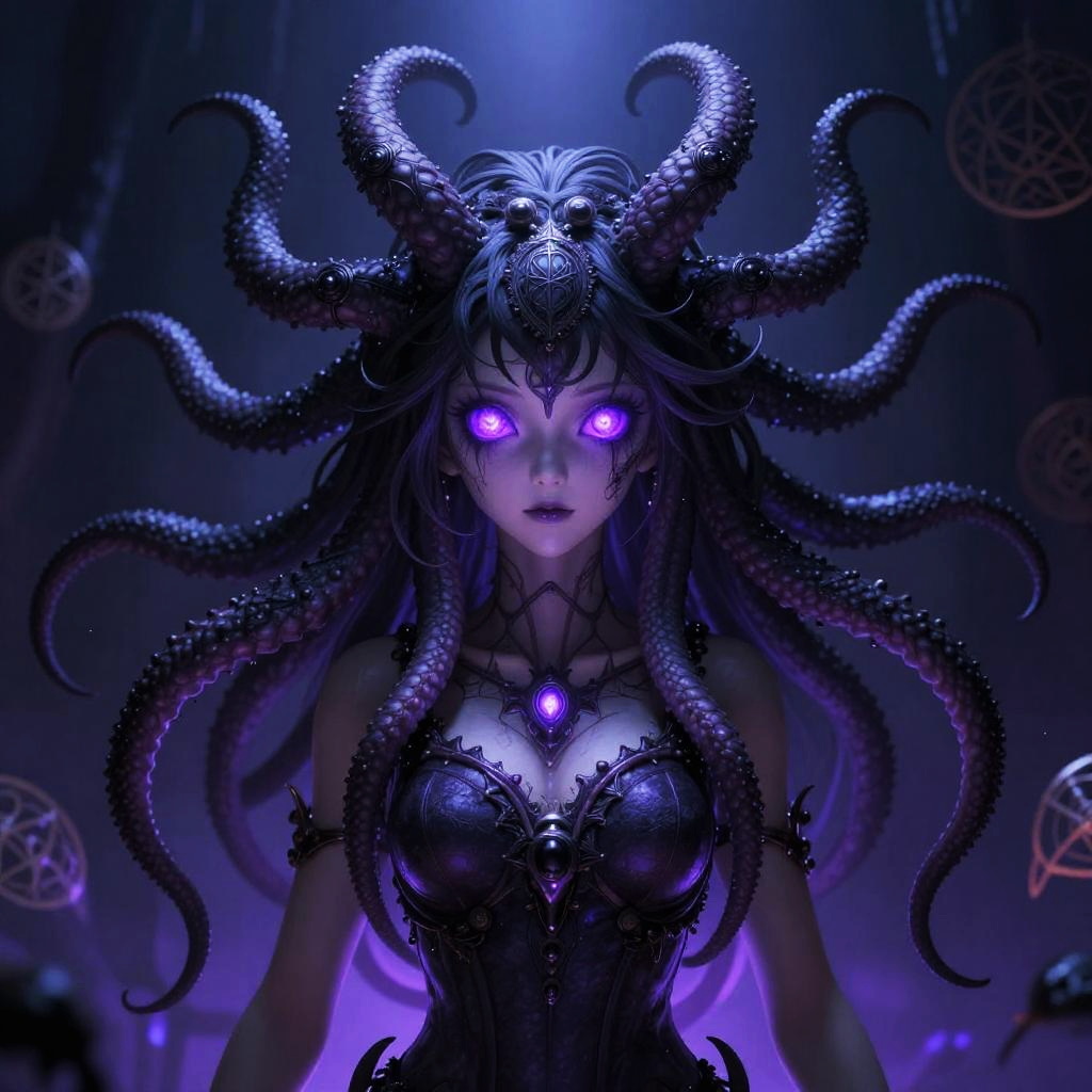 Eldritch anime girl with glowing purple eyes and tentacle hair, dark mystical background, arcane symbols floating, eerie otherworldly atmosphere, high detail, vibrant colors