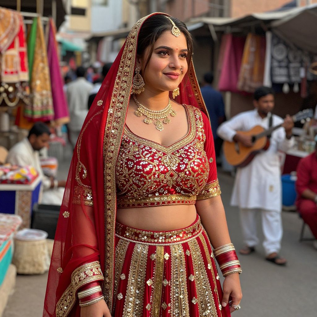 Photograph of a young South Asian woman in a vibrant red and gold traditional lehenga choli, with a matching veil, standing in a bustling market