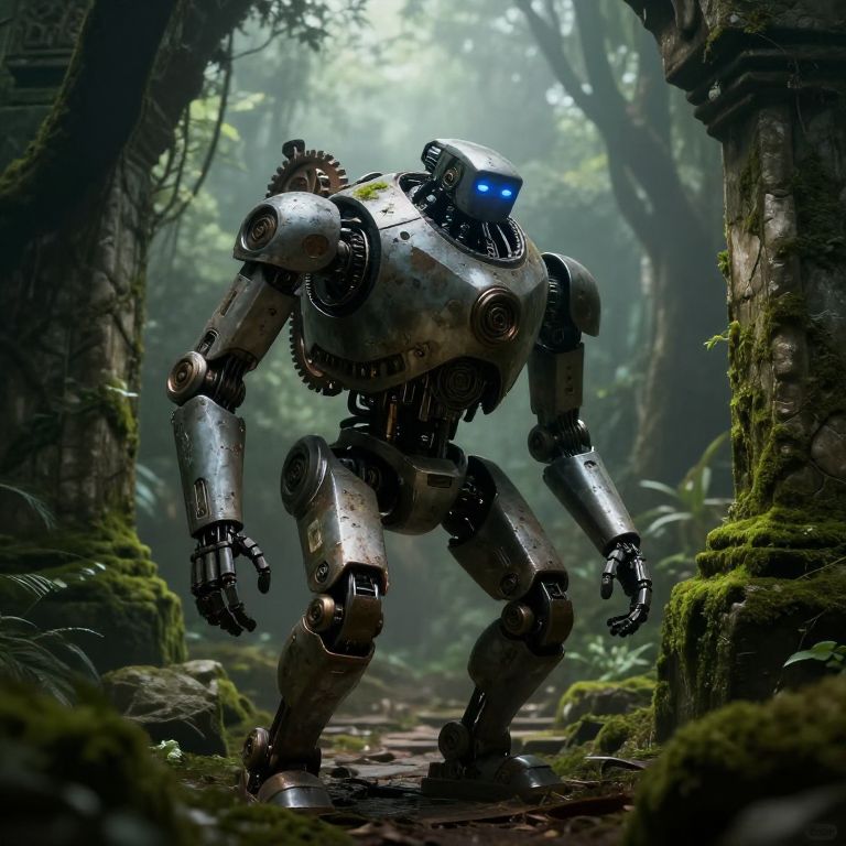 Robor exploring an ancient ruin, a robot with weathered metal plates and intricate gears, soft ambient light filtering through moss-covered stone pillars, misty jungle environment, cinematic atmosphere, concept art style.