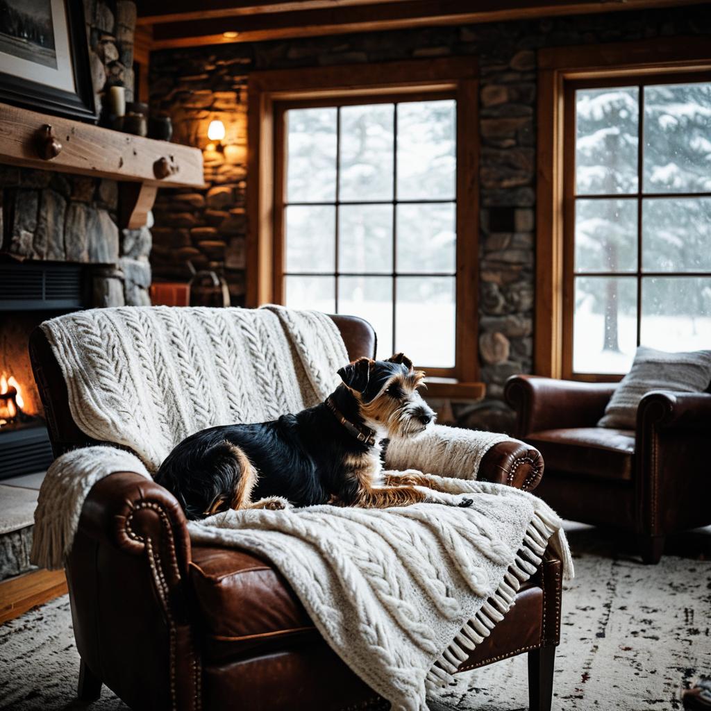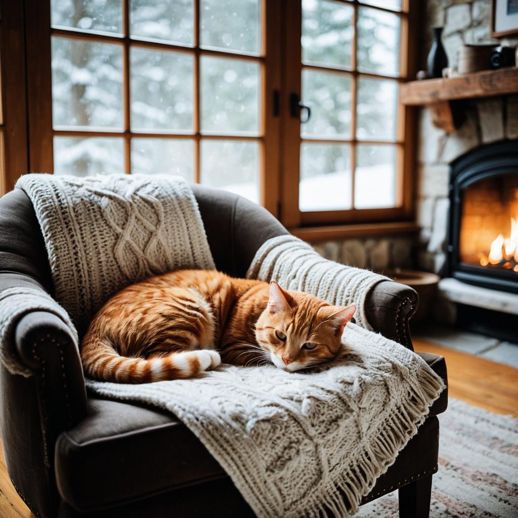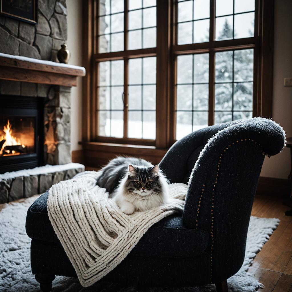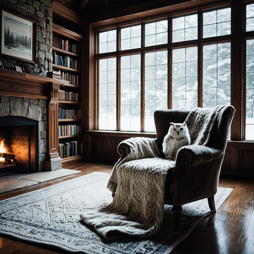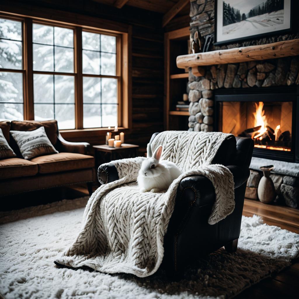 A warm and inviting photograph of a modern rustic room with natural wood elements, where a roaring fire dances in a rustic stone fireplace, casting a soft, flickering glow across the scene. Outside, a fierce snowstorm rages, captured through large windows adorned with delicate frost patterns. Nestled within the room, a plush, comfortable chair beckons, draped with a soft, knitted blanket that whispers of relaxation and tranquility. At the foot of the chair, a small, fluffy white bunny curls up, dozing peacefully in the comforting embrace of the room's warmth. This exquisite scene is captured using a Canon EOS R6 mirrorless camera paired with an RF 24-70mm f/2.8L IS USM lens, renowned for its remarkable clarity, color reproduction, and sharpness. The camera settings are meticulously chosen to evoke a sense of warmth and intimacy, with an aperture of f/4, ISO 800, and a shutter speed of 1/60 sec. The ambient lighting from the fireplace and soft, diffused light filtering through the snowstorm outside work in harmony, enveloping the room in a warm, golden hue that accentuates the rich textures and welcoming atmosphere.