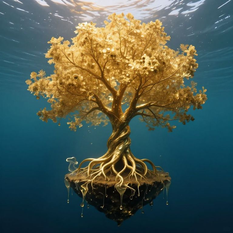 Emerging from the depths of the ocean, a radiant tree of liquid gold stands as a beacon of hope, its roots dripping with ethereal sap that solidifies into floating islands, symbolizing the eternal dance between creation and transience.