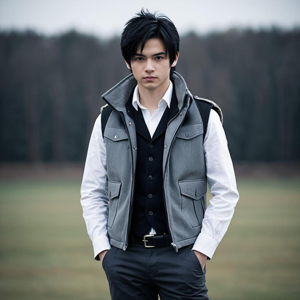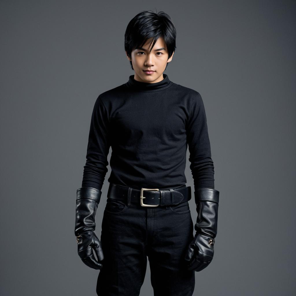 Portrait of an Asian young man standing against a grey background wearing a fitted black long-sleeve shirt, black pants, a black belt with a silver buckle, and long black leather fingerless gloves. The subject has black hair styled neatly and looks directly at the viewer with a closed mouth expression.