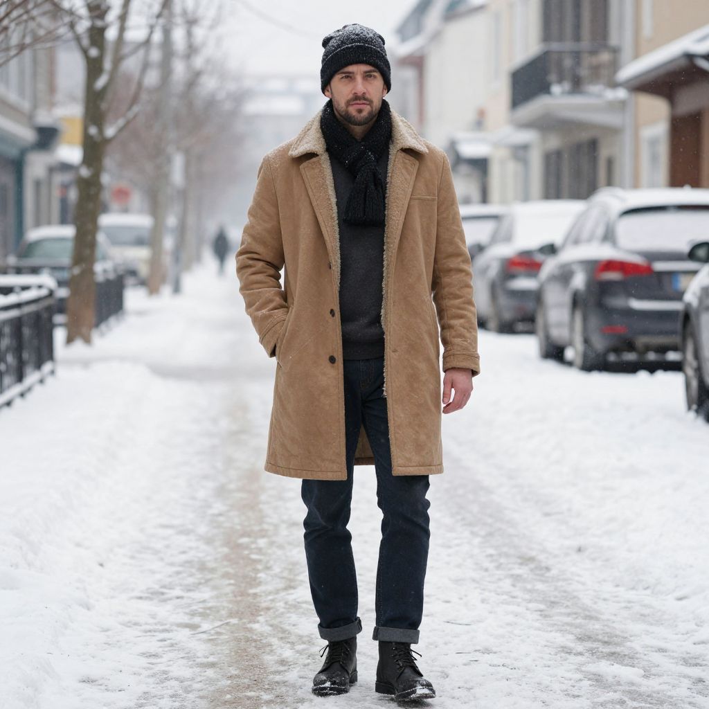 Man Winter Casual Outfit Costume, man in a coat and hat standing on a snowy street