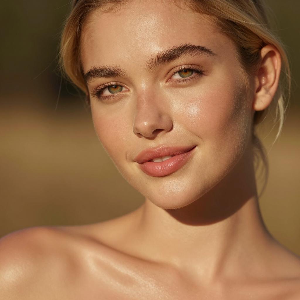Close-up photograph of a young woman with sun-kissed, shiny skin. She has blonde hair pulled back, arched eyebrows, light brown eyes, and full pink lips. She gazes slightly to the side with a subtle smile. Her bare shoulders are visible. Warm, golden sunlight illuminates her face and upper body. Blurred, golden background.