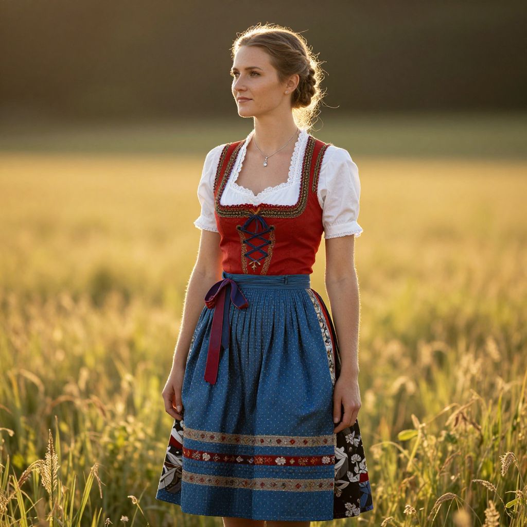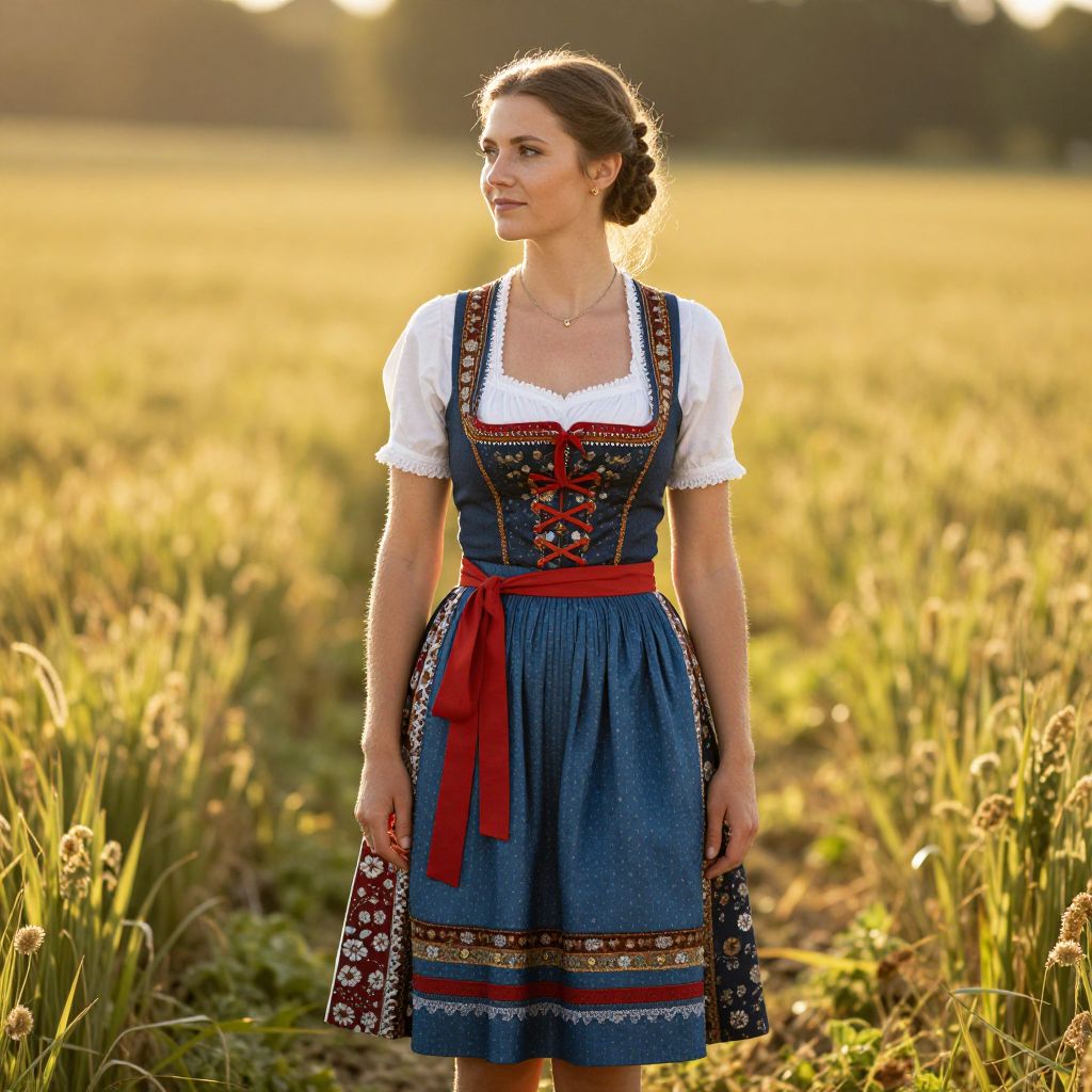Amidst the golden whispers of a sunlit field, a woman in a vibrant Midi Dirndl stands as a symbol of timeless tradition and serenity, her presence weaving a tapestry of cultural heritage and natural beauty.