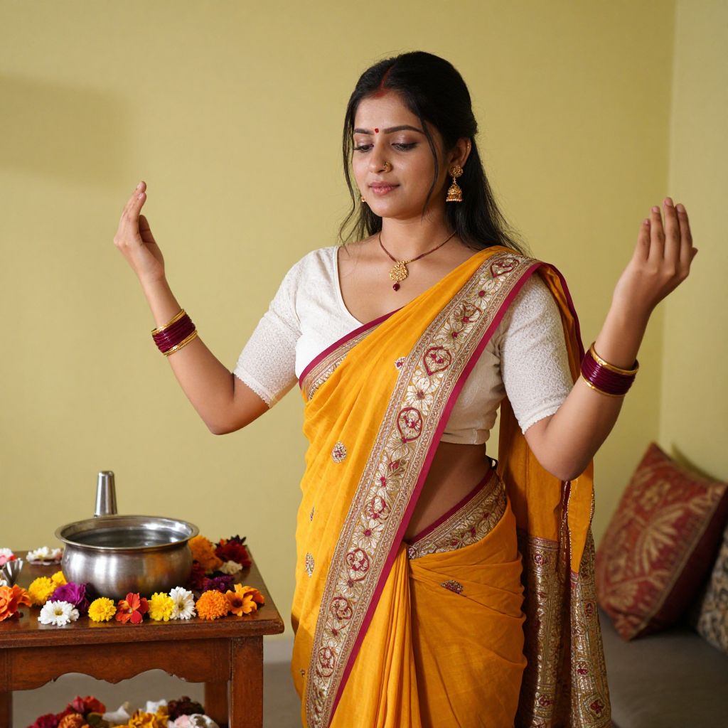 Realistic portrait of a vibrant young woman wearing a traditional karwa chauth look saree, including a tightly bound sari and a white cotton blouse, standing with her arms slightly raised in prayer beside a wooden altar decorated with flowers and a pot of water, her face glowing with focus and devotion, the setting in a traditional home in Punjab, early morning light casting soft shadows.. The woman has big tits and cute face