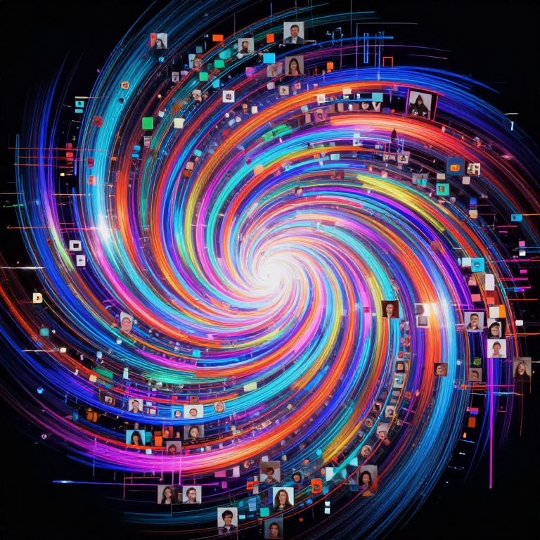 Digital artwork of a vibrant, colorful spiral galaxy with neon blue, orange, and purple rings, interspersed with small, floating square icons against a