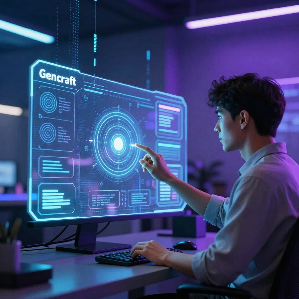 Gencraft AI review scene showing a user interacting with an advanced AI interface on a futuristic transparent screen, surrounded by glowing data streams and holographic widgets, high-tech workspace, cyberpunk aesthetics, vibrant blue and purple hues.